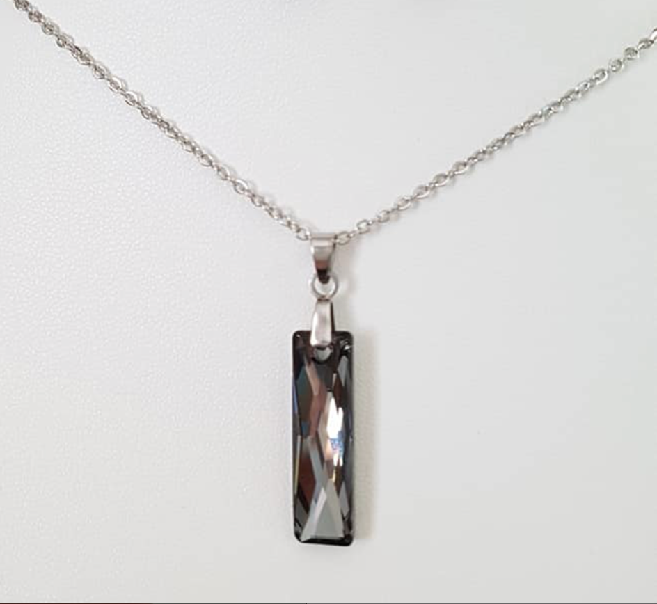 Stunning Black Swarovski Crystal Baguette Pendant accented with a tarnish-resistant stainless steel chain. Swarovski crystal is considered the purest in the world; its brilliance and durability remain unmatched. Crystal Height: 25mm. Width: 7mm