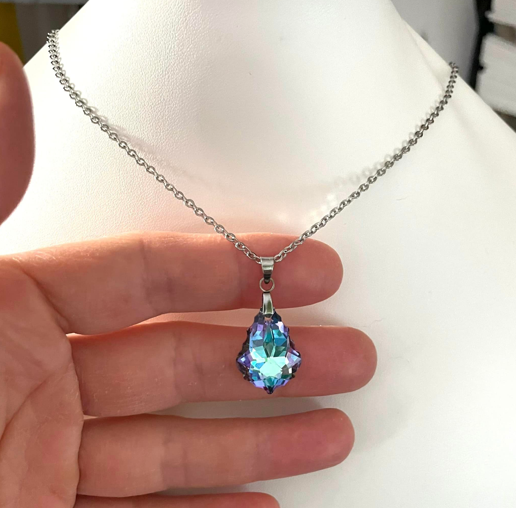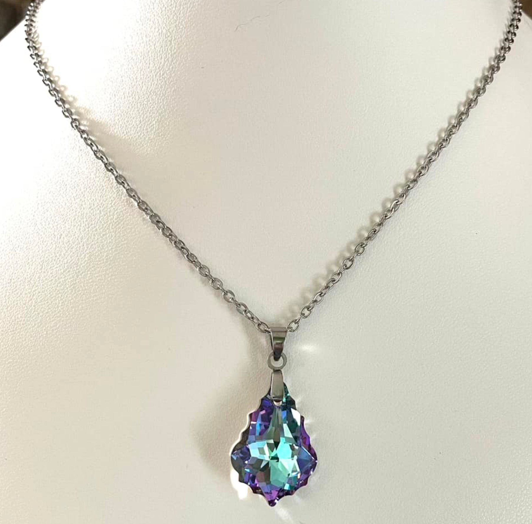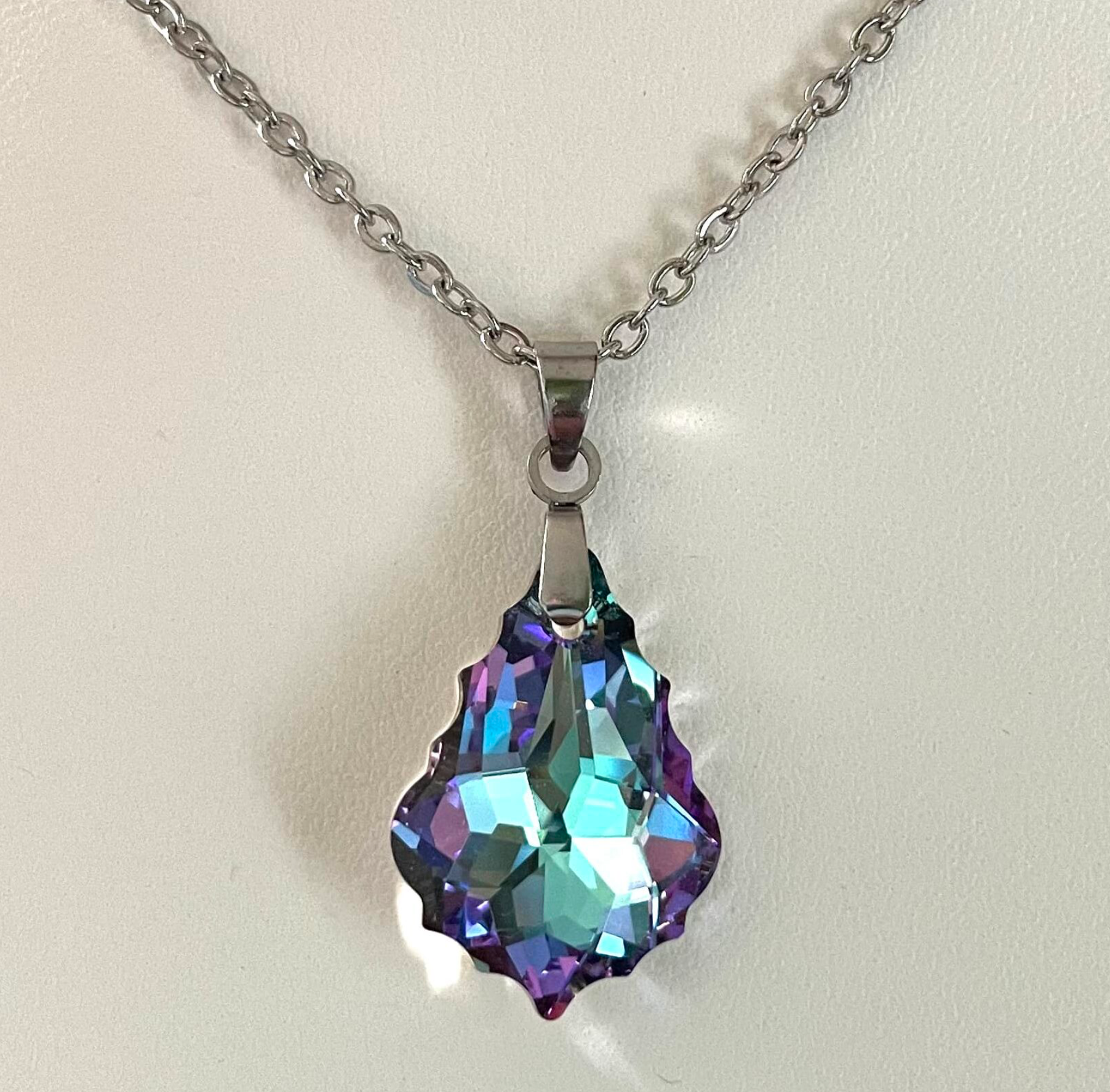 Stunning large baroque vitrail crystal pendant set with a tarnish-free stainless steel chain. Height: 22mm, Width: 16mm