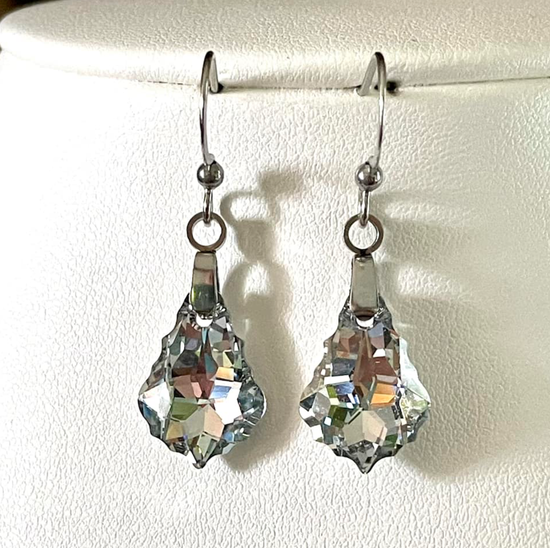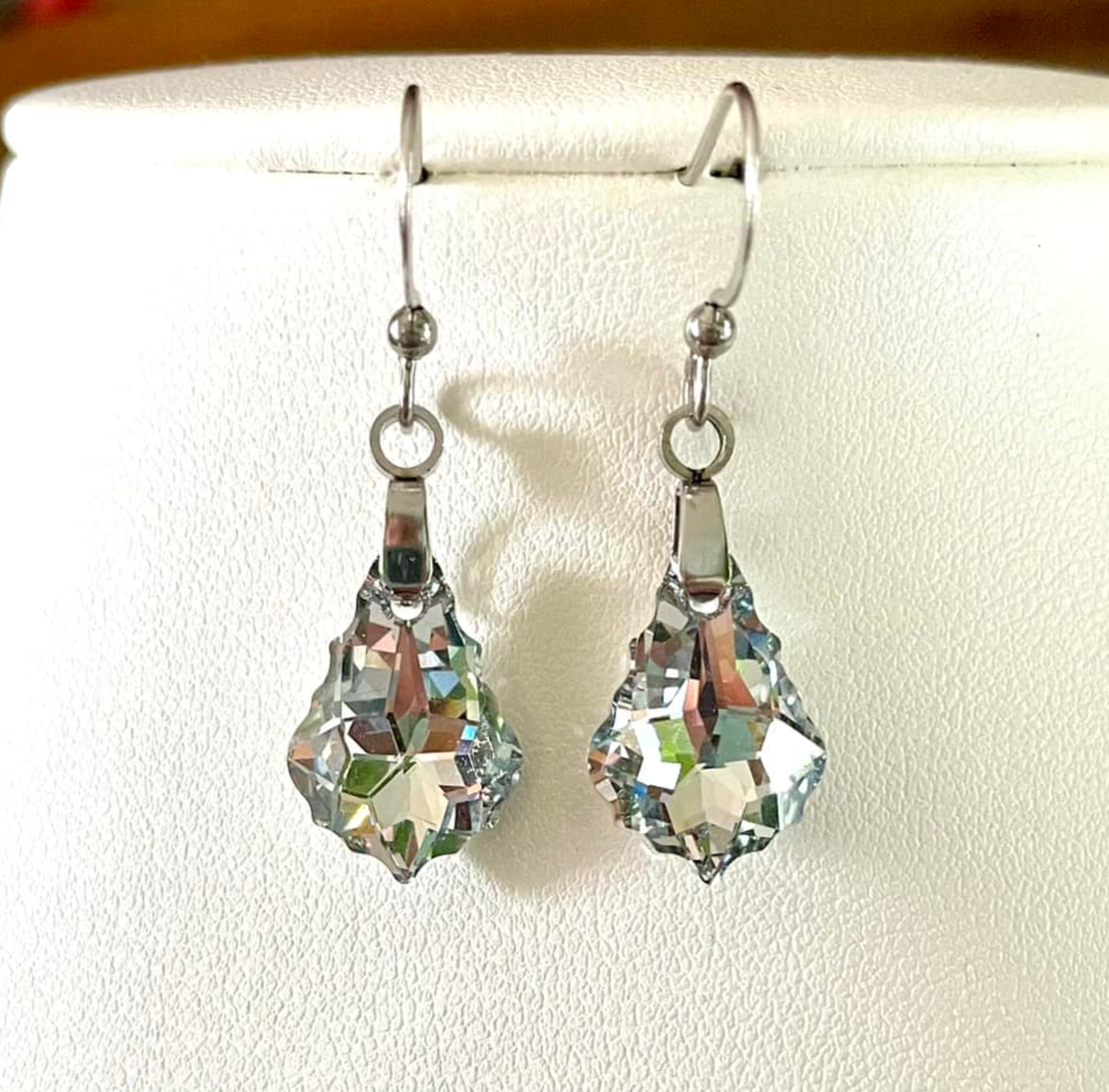 Boucles d’oreilles en cristal modèle “baroque” couleur Argenté et crochets en acier inoxydable hypoallergènes qui ne s’oxydent pas. Longueur totale des boucles: 35 mm. Longueur du cristal: 16mm