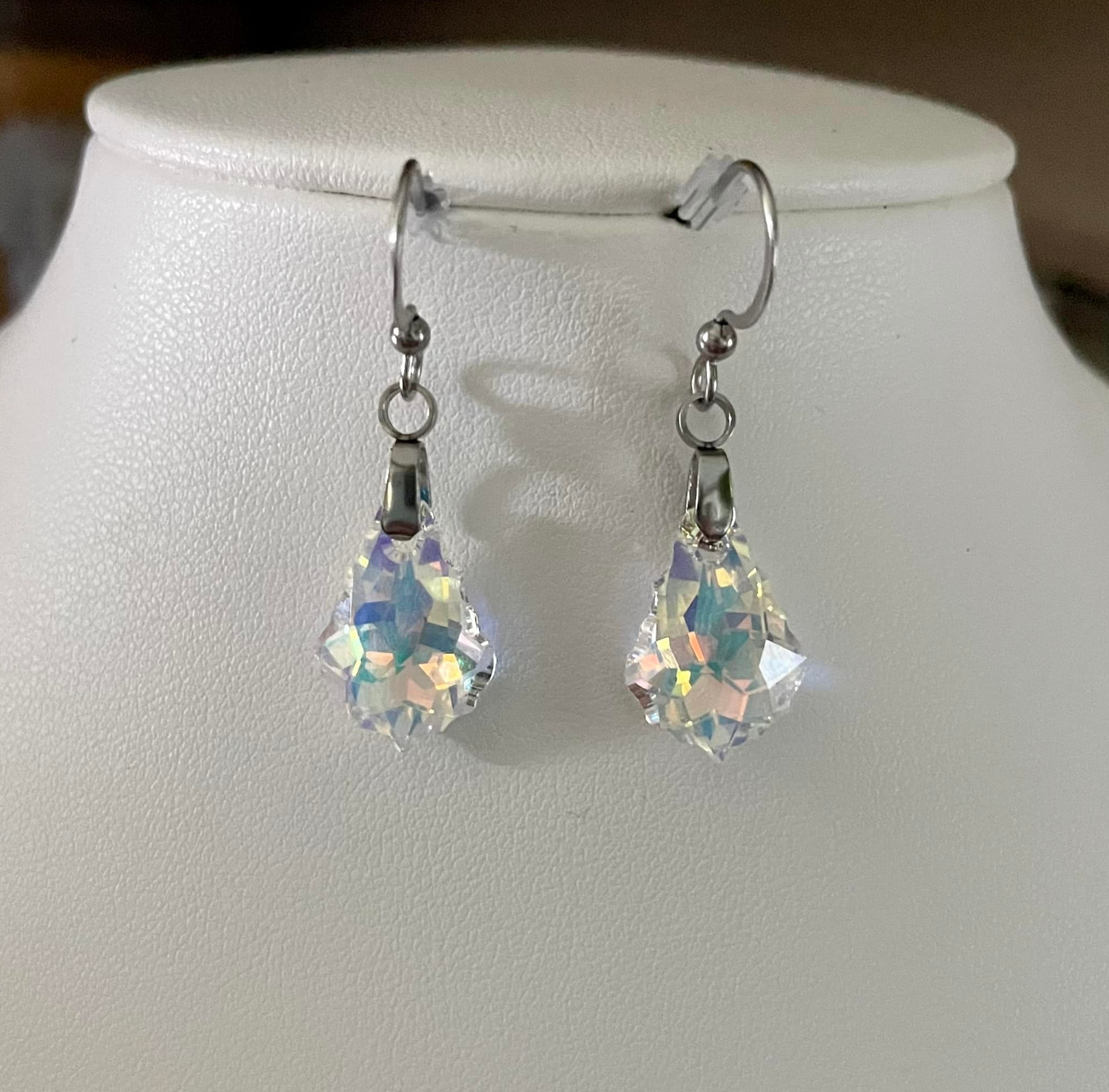 Boucles d’oreilles en cristal modèle “baroque” couleur Aurore Boréale et crochets en acier inoxydable hypoallergènes qui ne s’oxydent pas. Longueur totale des boucles: 35 mm. Longueur du cristal: 16mm