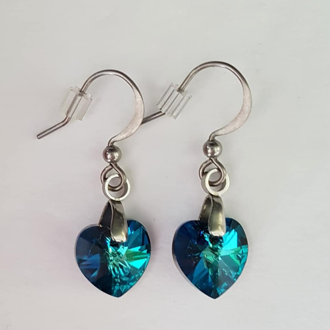 Magnifiques boucles d’oreilles coeur en cristal Bleu Bermudes avec crochets en acier inoxydable hypoallergène et stoppeur en silicone. Diamètre du coeur: 10mm (1cm) et longueur totale des boucles : 30 mm (3cm).