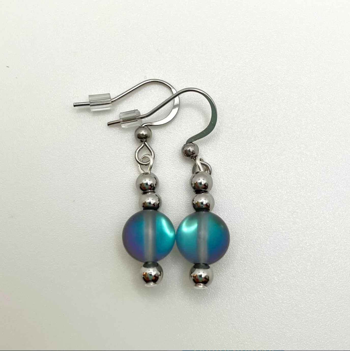 Boucles d’oreilles en cristal sirène gris-bleu et crochets en acier inoxydable hypoallergène qui ne s’oxyde pas. Cristal de 8mm et Billes 4mm en acier inoxydable.