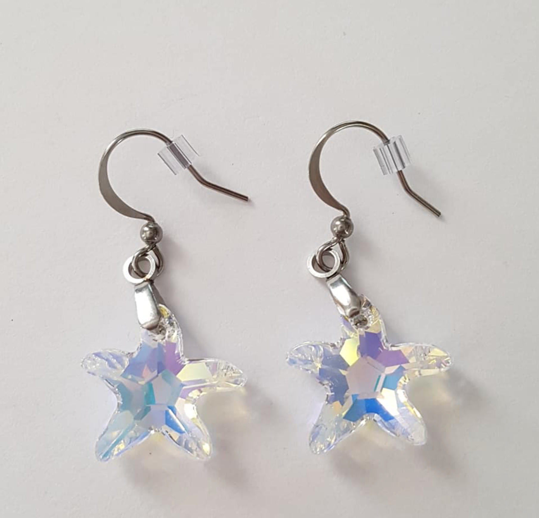 Boucles d’oreilles Étoile de mer en cristal Aurore Boréale Dorée et crochets en acier inoxydable hypoallergène qui ne s’oxyde pas. Longueur totale des boucles: 38 mm. Hauteur de l’étoile: 18mm.