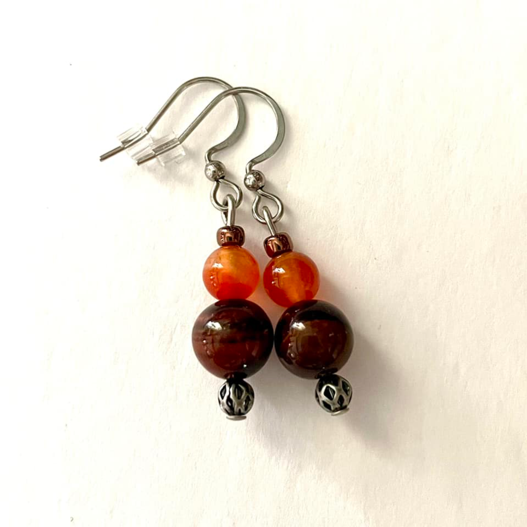 Boucles Transformation en oeil de tigre rouge et cornaline. Crochets en acier inoxydable hypoallergène qui ne s’oxydent pas.