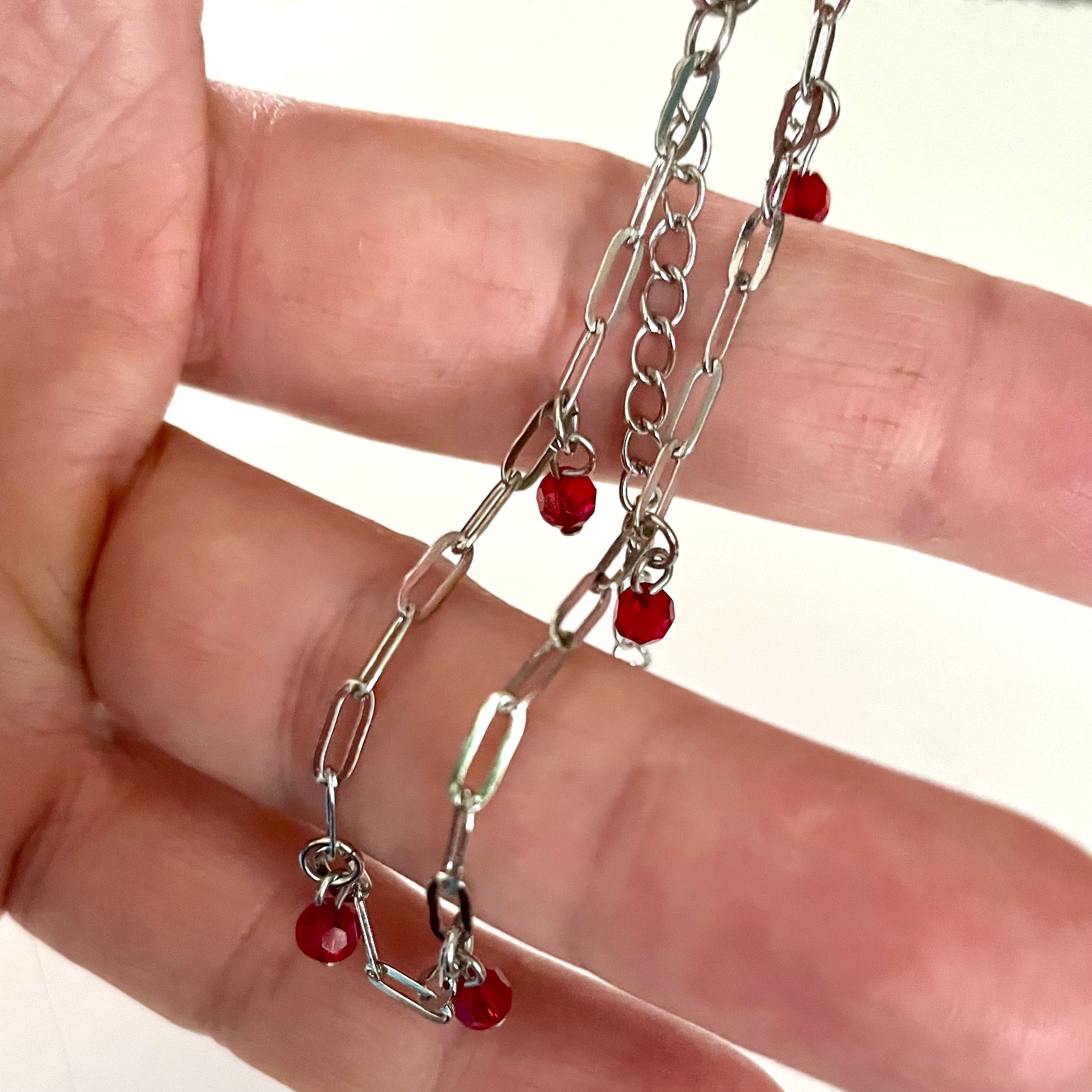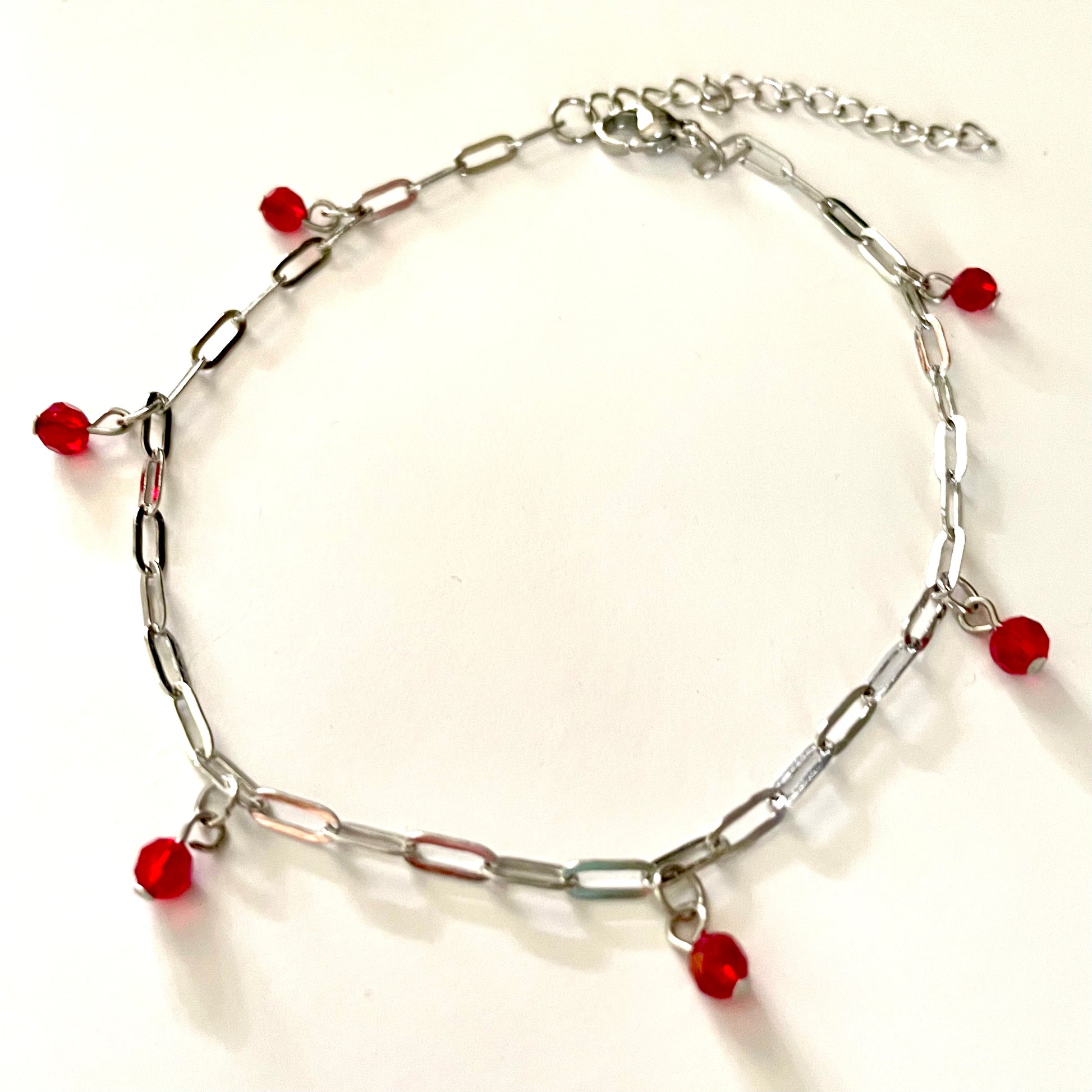 Chaîne de cheville en acier inoxydable et cristal rouge. Ajustable de 8,75 pouces à 10,5 pouces.(22 à 27cm). Ce bracelet peut être porté partout, est résistant à l'eau et ne ternit pas.