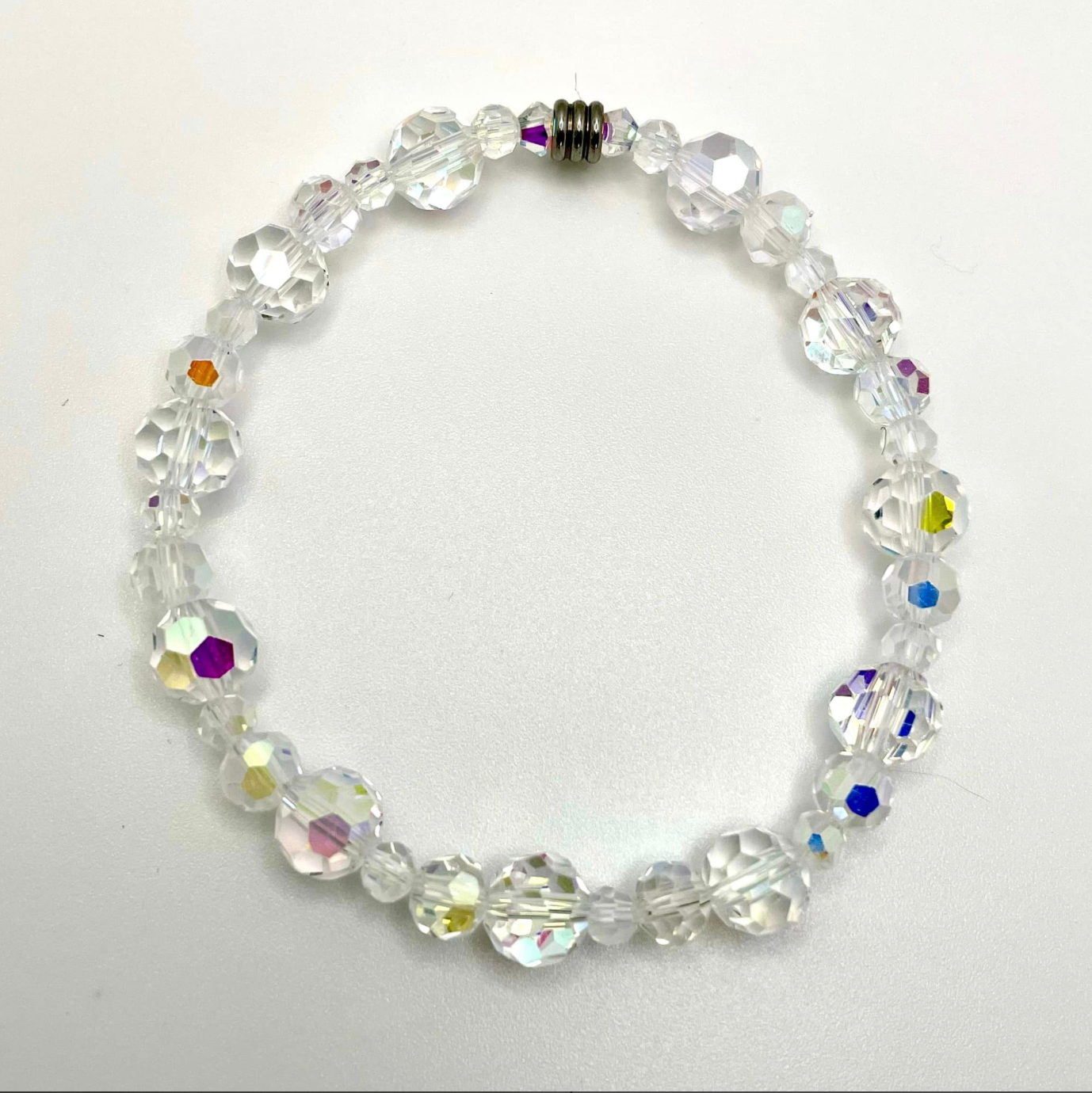 Bracelet “Énergie” en cristal étincelant aurore boréale. Monté sur corde élastique résistante. Bille de 4, 6 et 8mm.