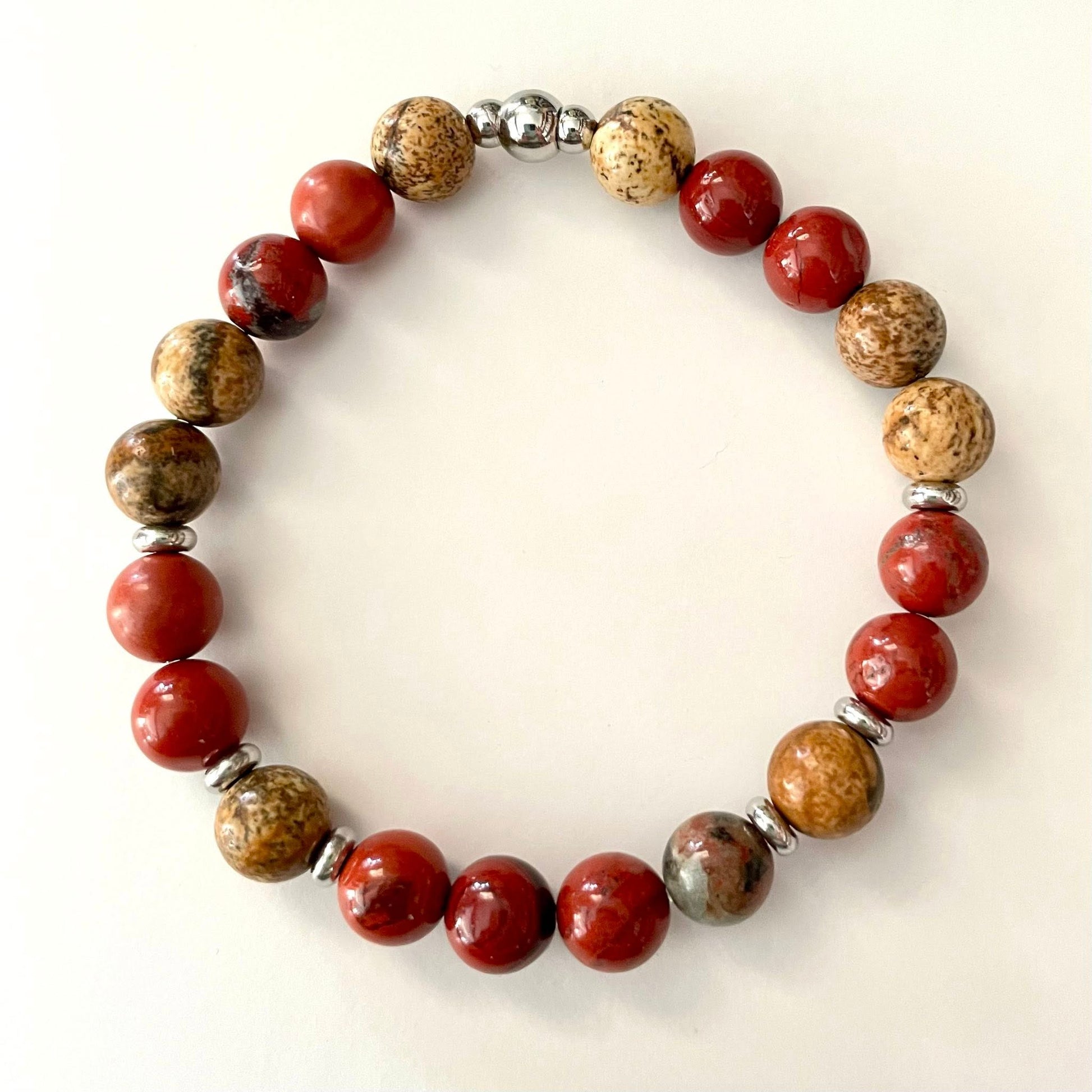 Bracelet « Force de la Terre » en jaspe rouge, jaspe paysage et inox. Billes 8mm.