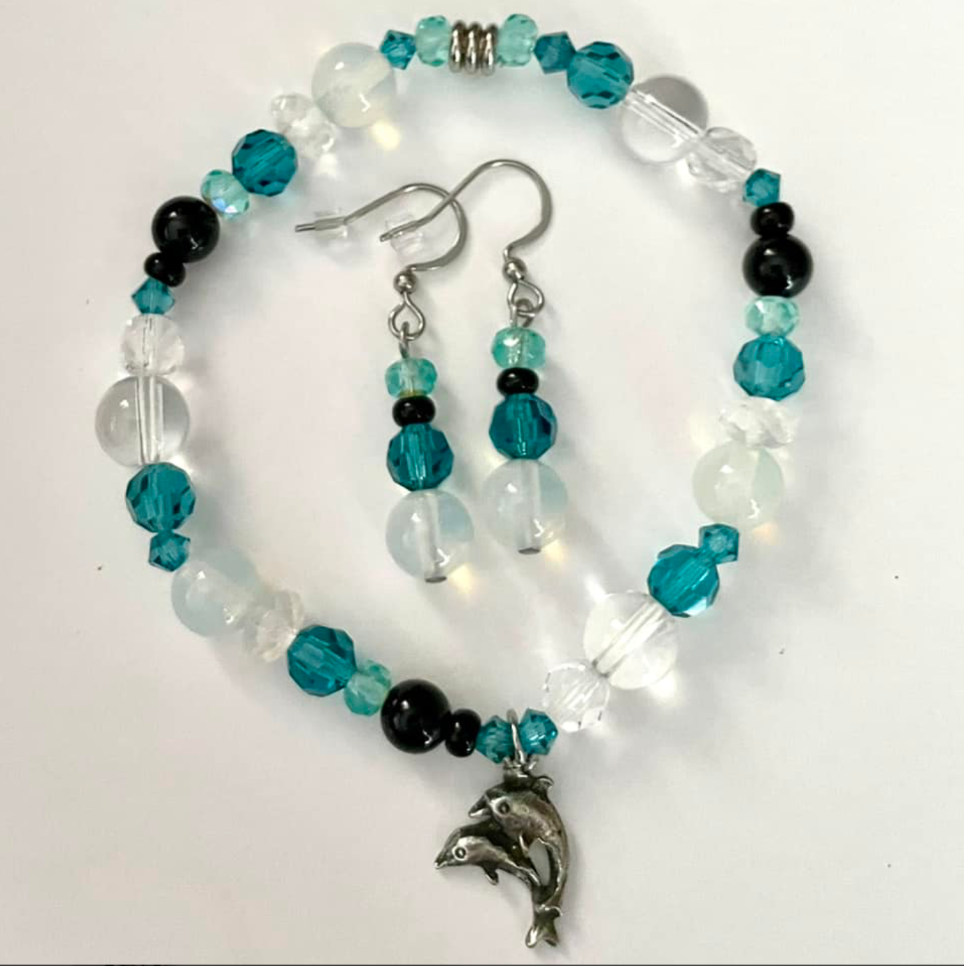 Sublime bracelet extensible en cristal, agate opale, onyx noir et quartz clair. Il apporte de l’énergie, de la sérénité, de l’abondance et nous connecte à la magie de l’océan. Petits dauphins en étain. Boucles assorties vendues séparémentd sur une autre fiche.