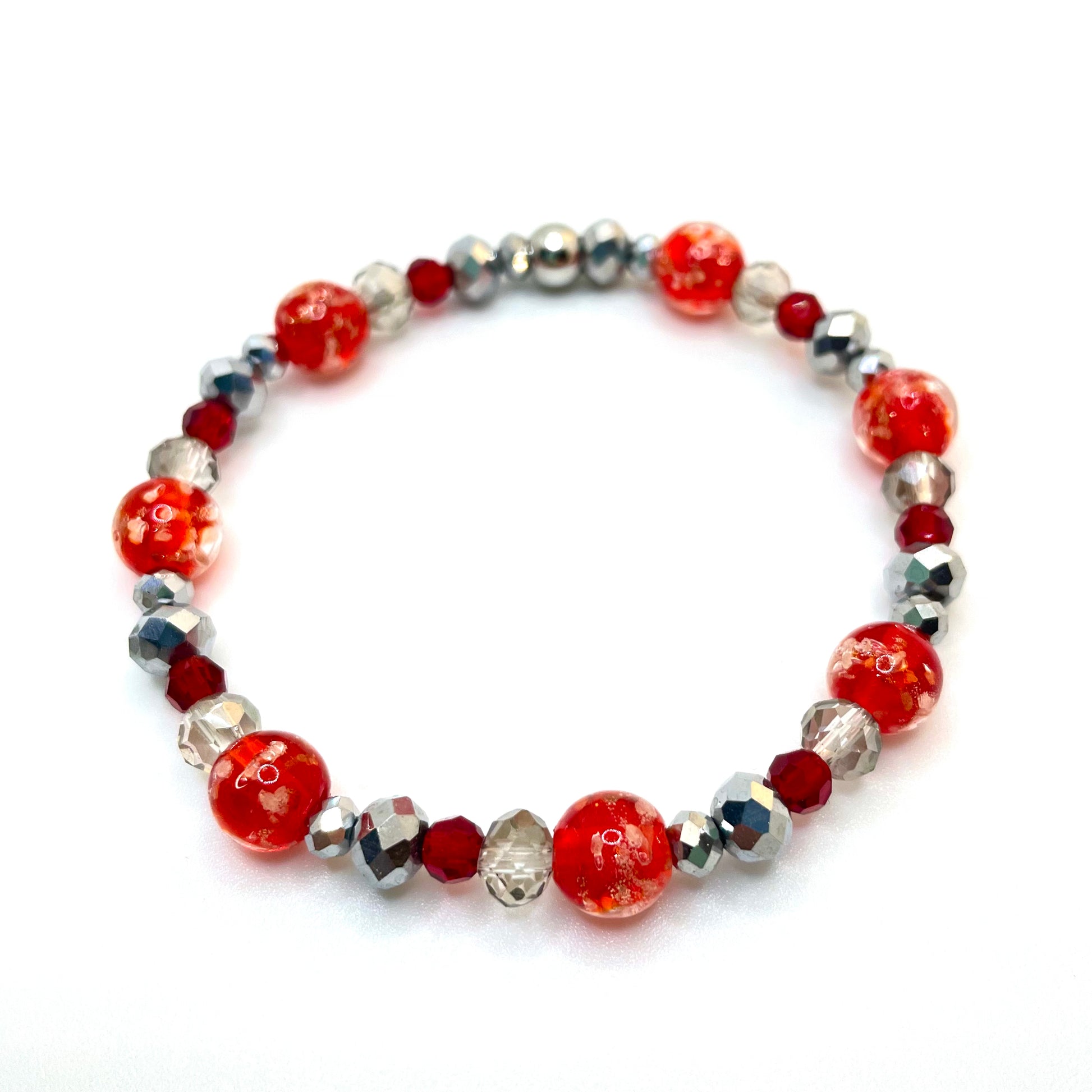 Bracelet Passion Flamboyante en cristal véritable de couleur rouge et super-argenté avec des billes phosphorescentes de verre souflé  de 8, 6 et 4mm et cache noeud en inox. Lorsque soumi à une lumière vive pendant au moins 30 secondes, il illumine dans le noir.
