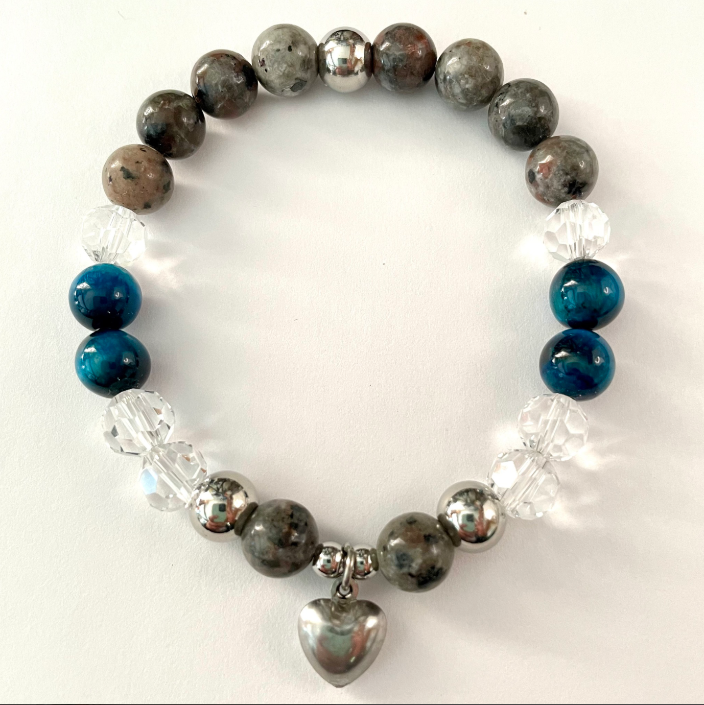 Bracelet “Sérénité” en oeil de tigre bleu, cristal, yooperlite et inox, monté sur corde élastique résistante. Bille de 6 et 8mm.