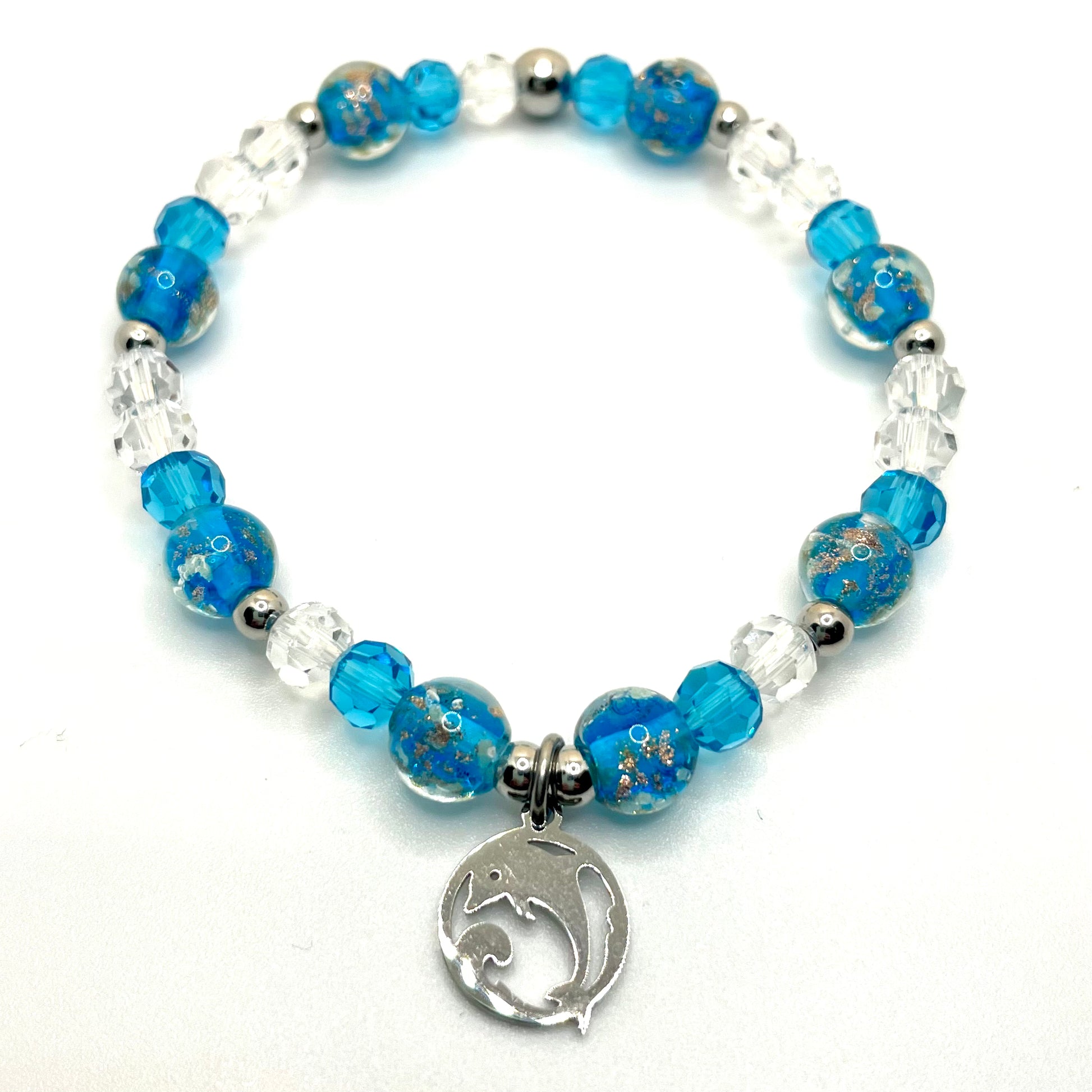 Bracelet "Surmonte Tout" en cristal bleu, cristal clair, cristal Phosphorescent qui brille dans le noir et inox. Billes de 8mm, 6 et 4mm. Pour charger les billes phosphorescentes, les mettre sous une lumière vive au moins 30 secondes, éteignez la  lumière et admirer votre bracelet!