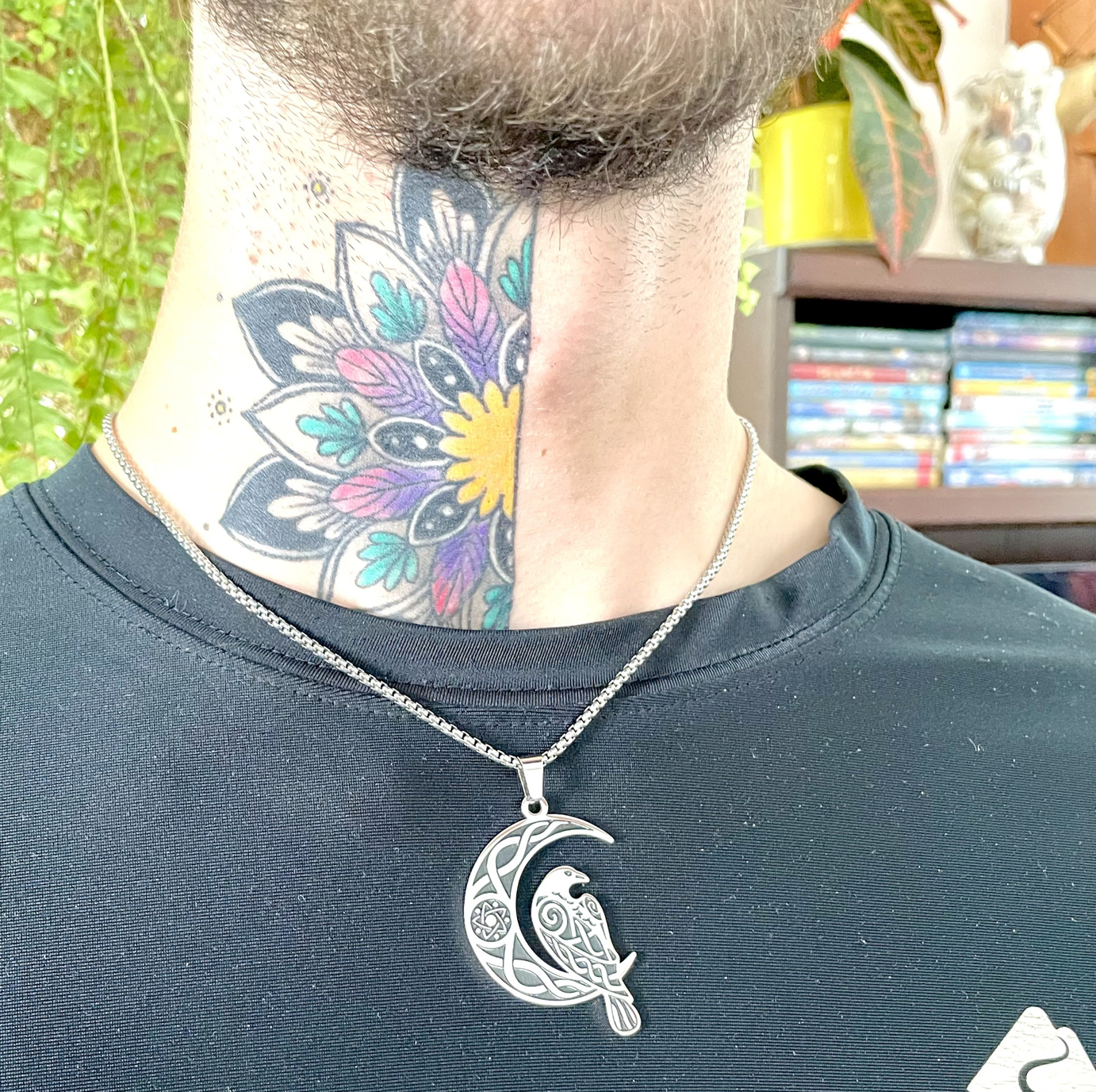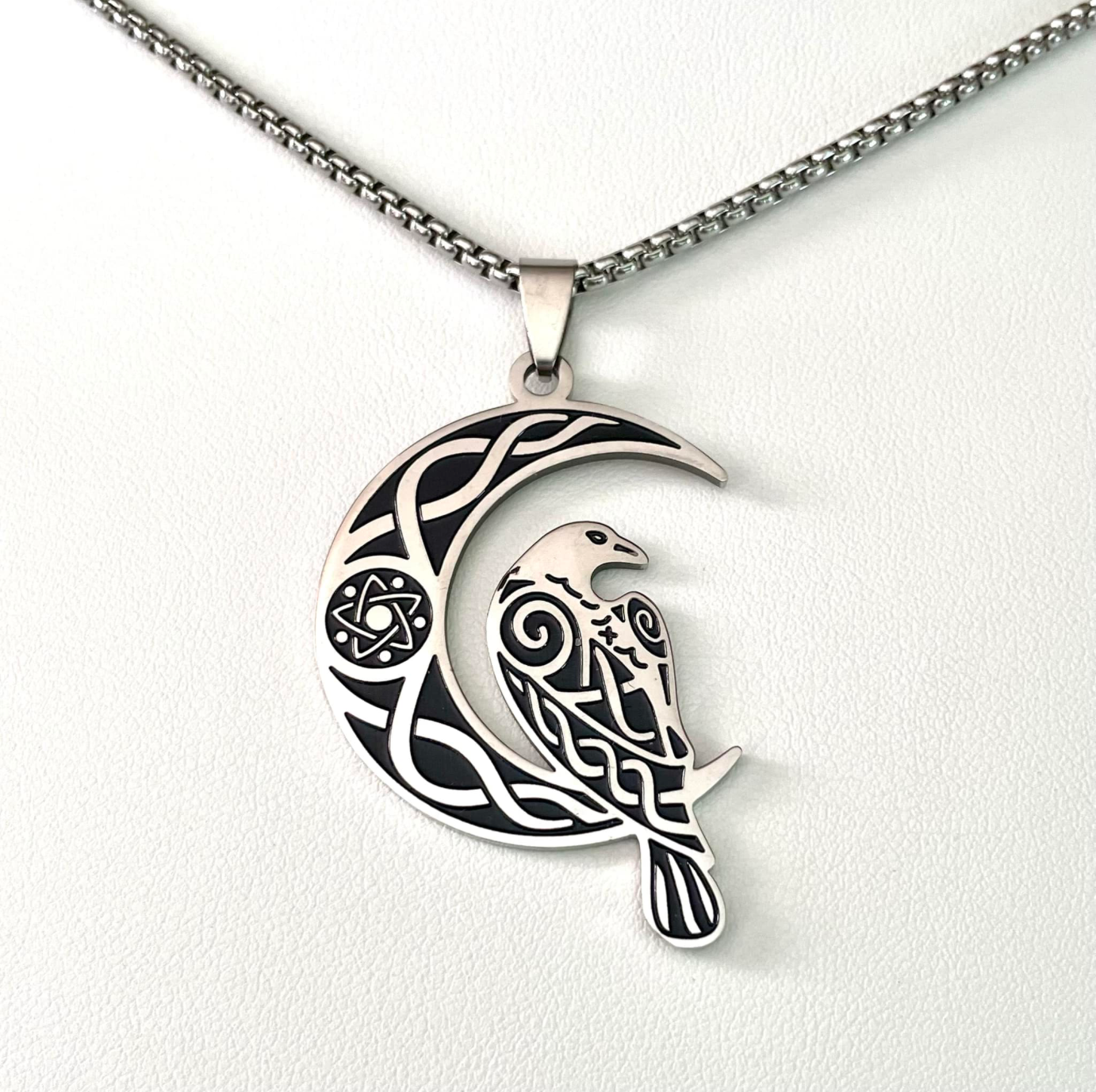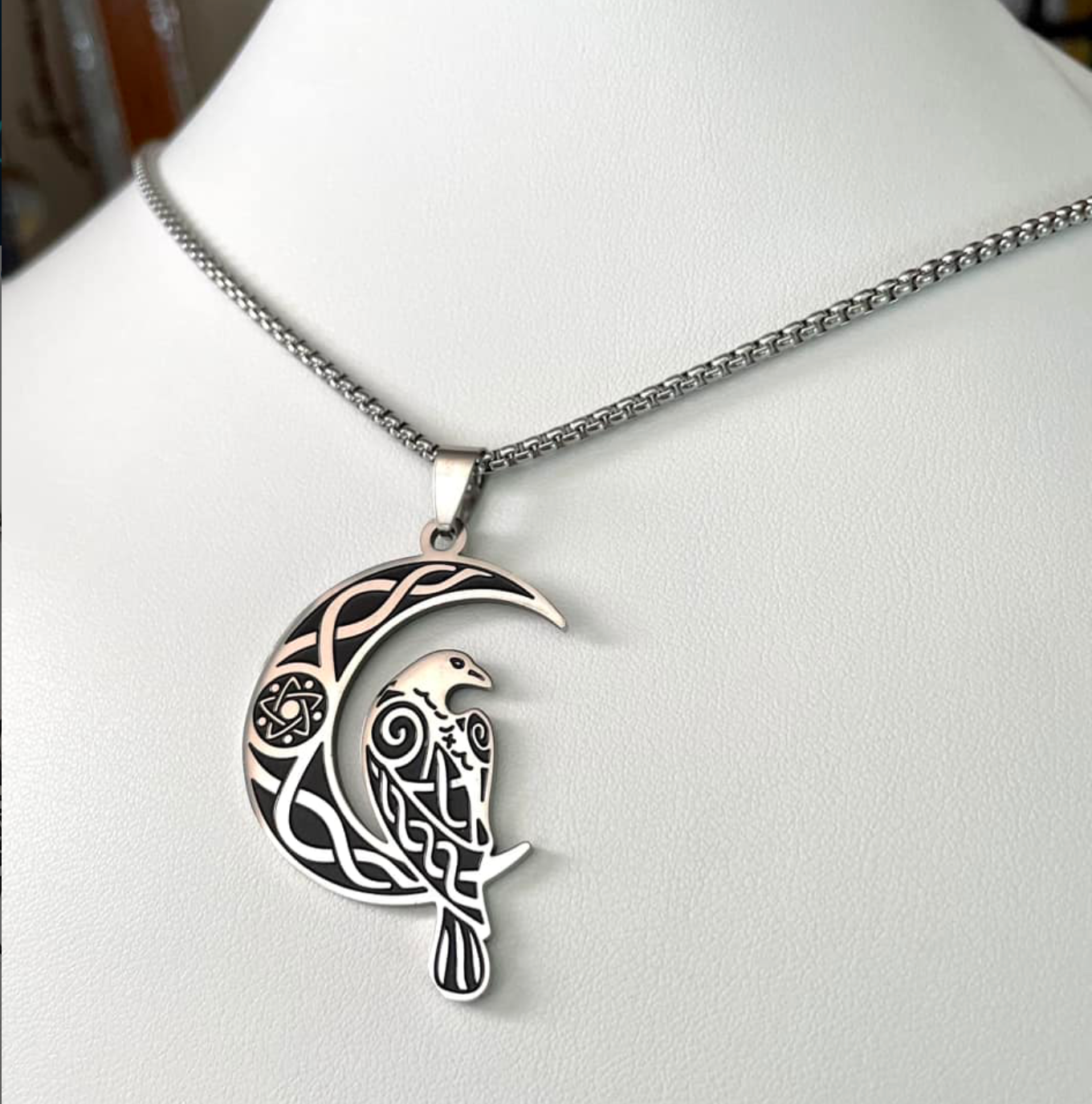 Pendentif Corbeau Viking perché sur la Lune en inox. Il représente la connaissance, la sagesse, la clairvoyance, la fidélité, le courage et la longévité. La mythologie Nordique l’associe au Dieu Odin, qui envoyait chaque jour ses 2 corbeaux faire le tour du monde.