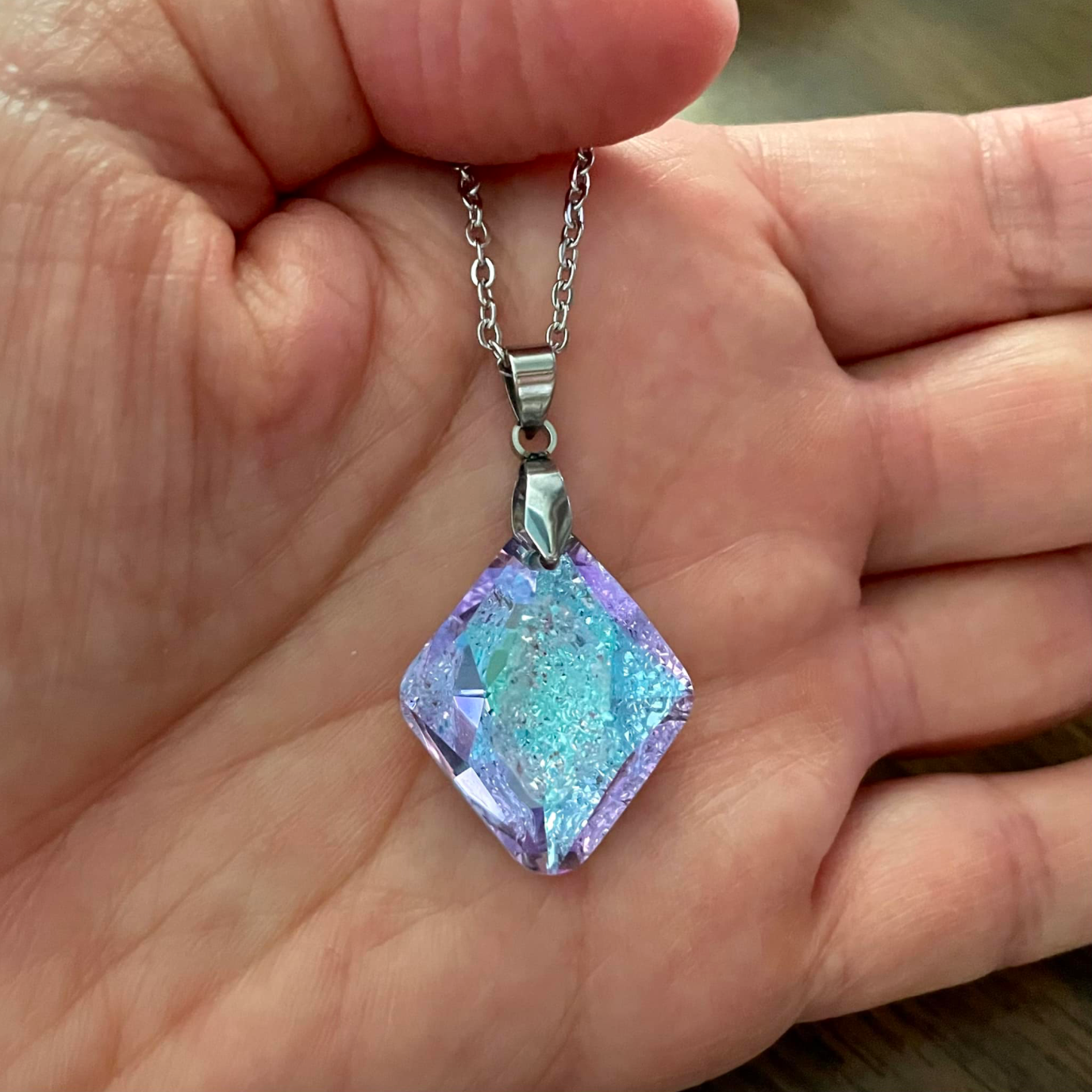 Merveilleux pendentif Cristal Rhombus Vitrail mis en valeur avec une chaîne en acier inoxydable qui ne ternit pas. Ce qu’il y a de particulier avec ce cristal, c’est qu’il comporte une géode en son centre avec un petit creux remplie de petits cristaux! (voir autre photo) Hauteur du cristal: 27mm. Largeur: 22mm.