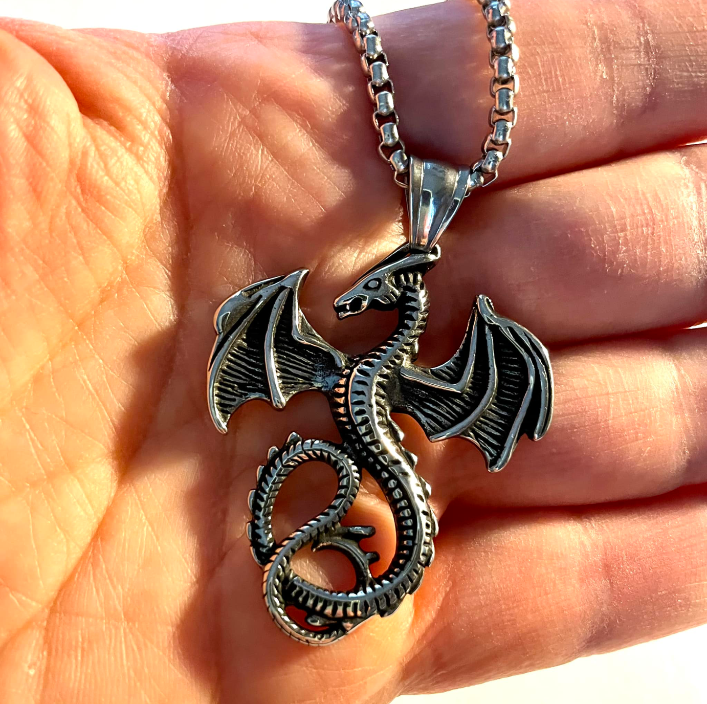 Magnifique dragon ailé en inox avec sa superbe chaîne! Ne ternit pas. Dimension: 36 x 50mm. Collier unisexe.