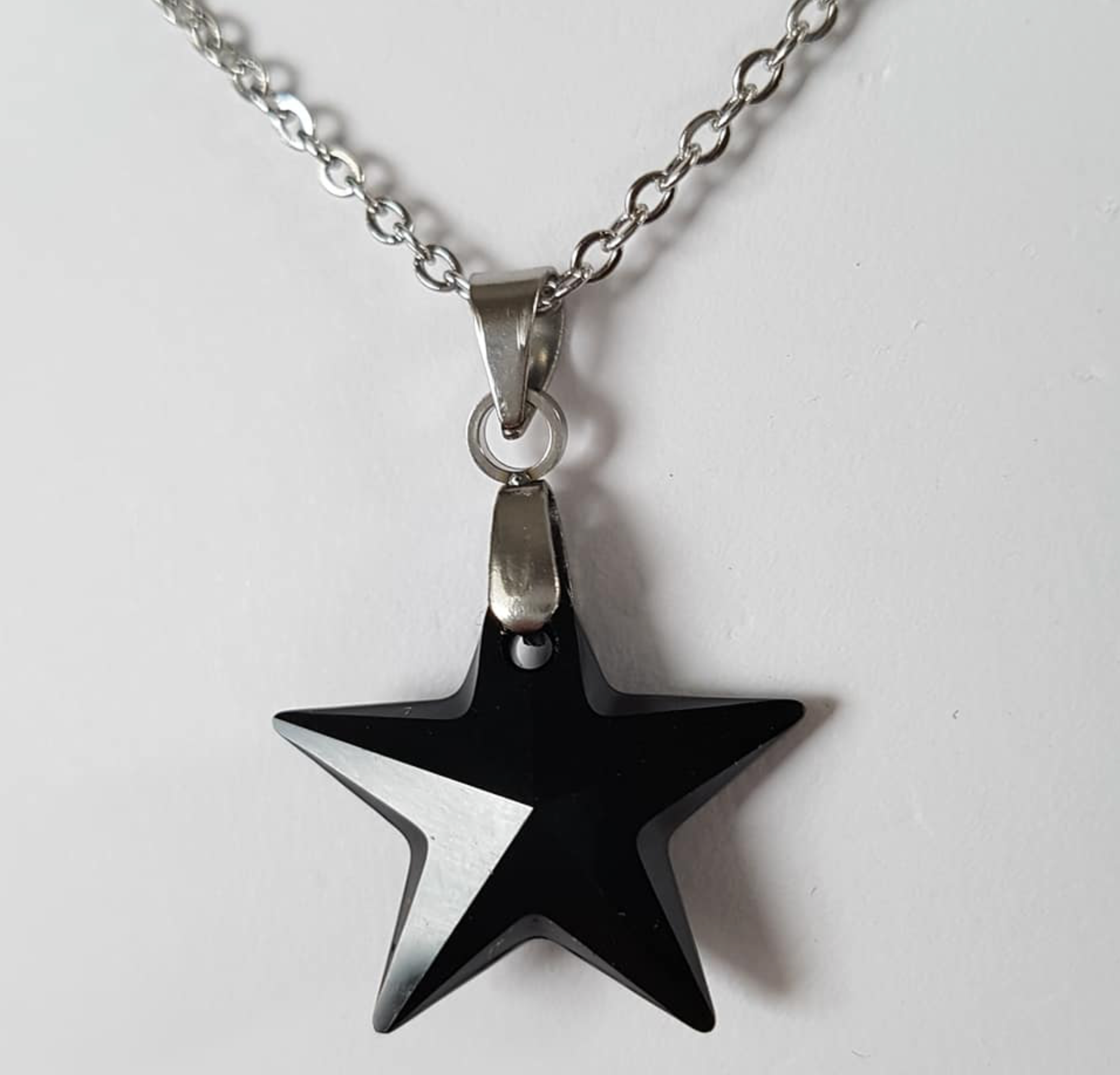 Superbe pendentif étoile droite en cristal noir mis en valeur avec une chaîne en acier inoxydable qui ne ternit pas. Diamètre: 16mm.