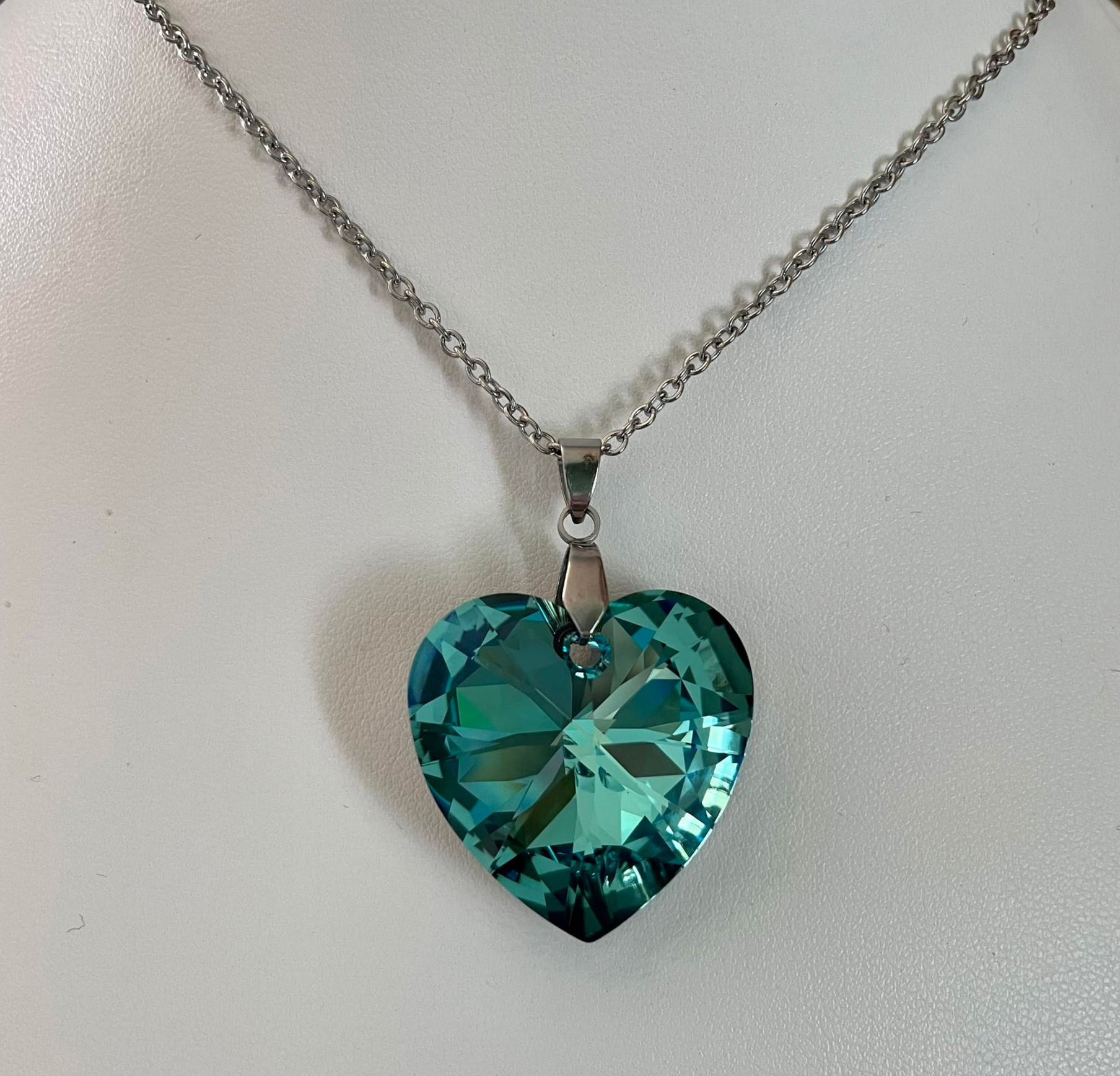 Superbe pendentif extra gros coeur cristal Bleu Bermudes Shimmer mis en valeur avec une chaîne en acier inoxydable qui ne ternit pas. Diamètre: 27mm.