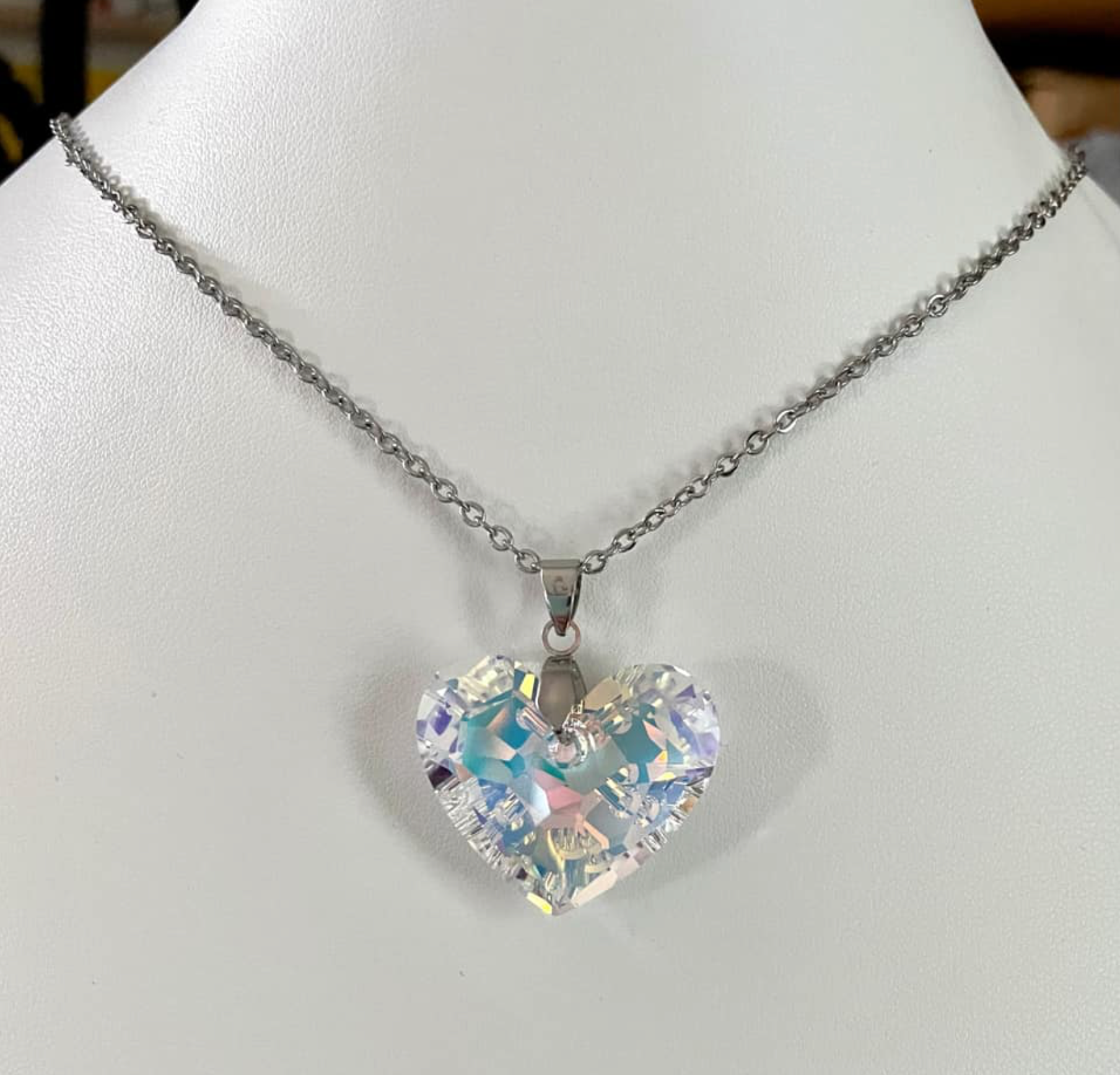 Superbe pendentif extra gros coeur “vrai amour” en cristal Aurore Boréale dorée mis en valeur avec une chaîne en acier inoxydable qui ne ternit pas. Diamètre: 28mm.