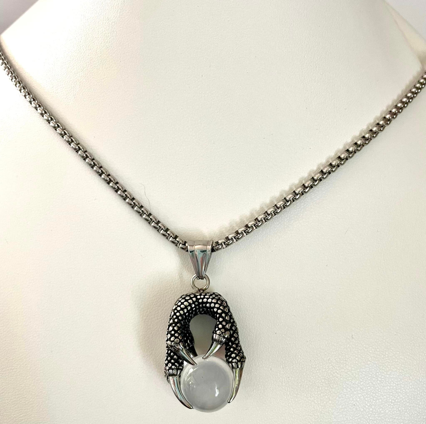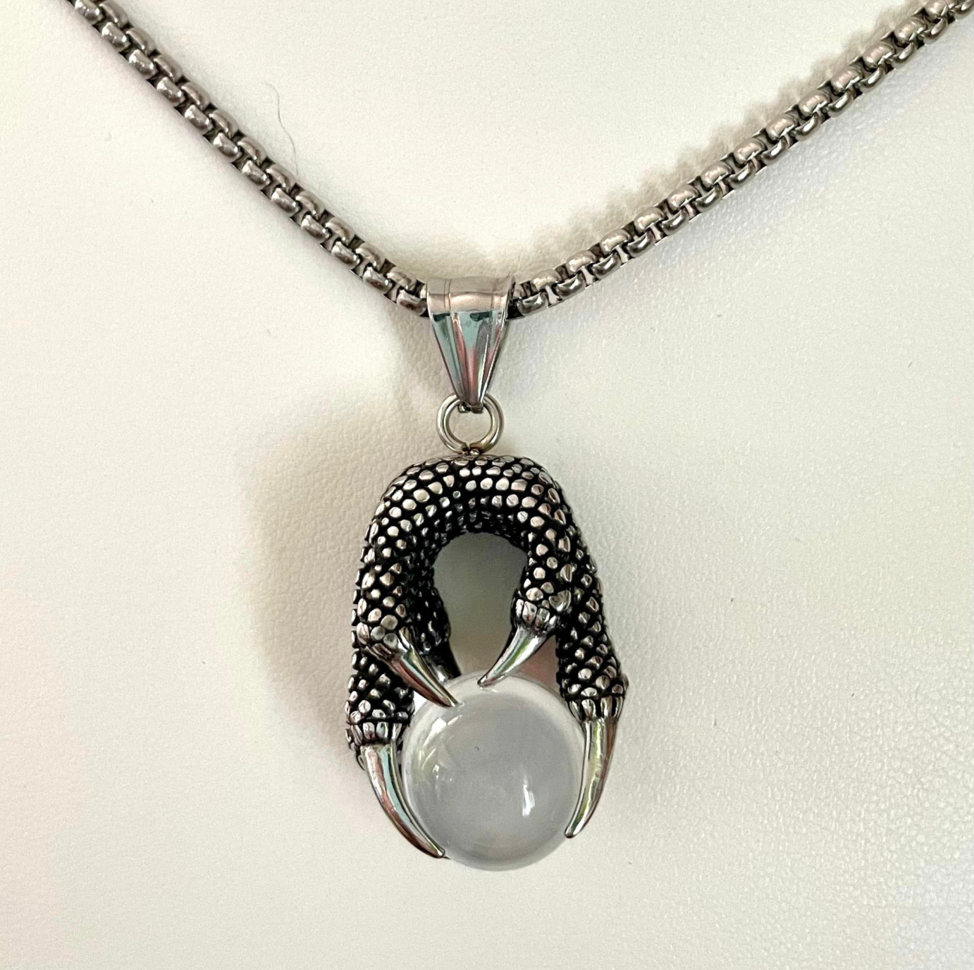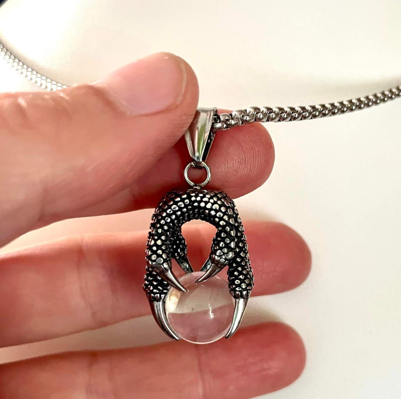 Magnifique griffe de dragon en inox ornée d’une bille en cristal bleue avec sa superbe chaîne! Ne ternit pas. Dimension: 40 x 21m