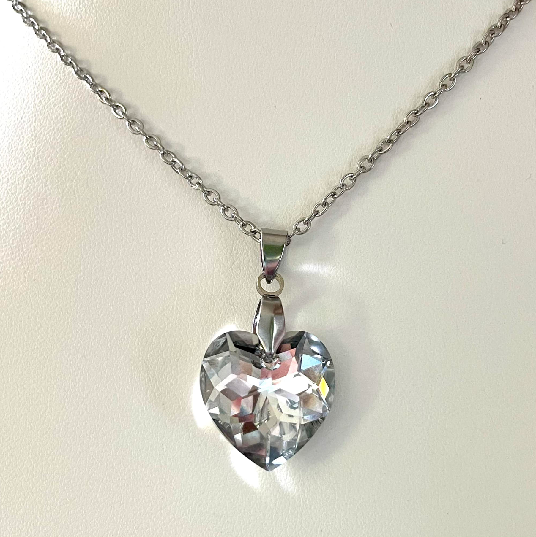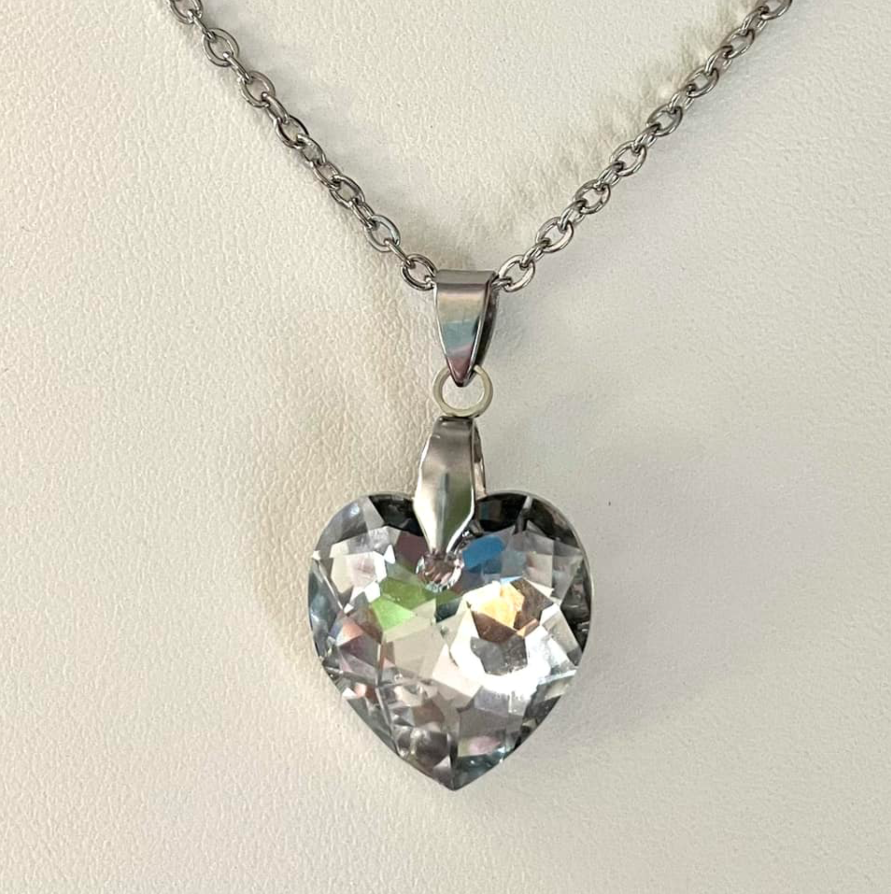 Superbe pendentif gros coeur en cristal extra-facetté Argenté shimmer mis en valeur avec une chaîne en acier inoxydable qui ne ternit pas. Diamètre du coeur: 18mm, c’est -à-dire environ la grosseur d’un 5 cents.