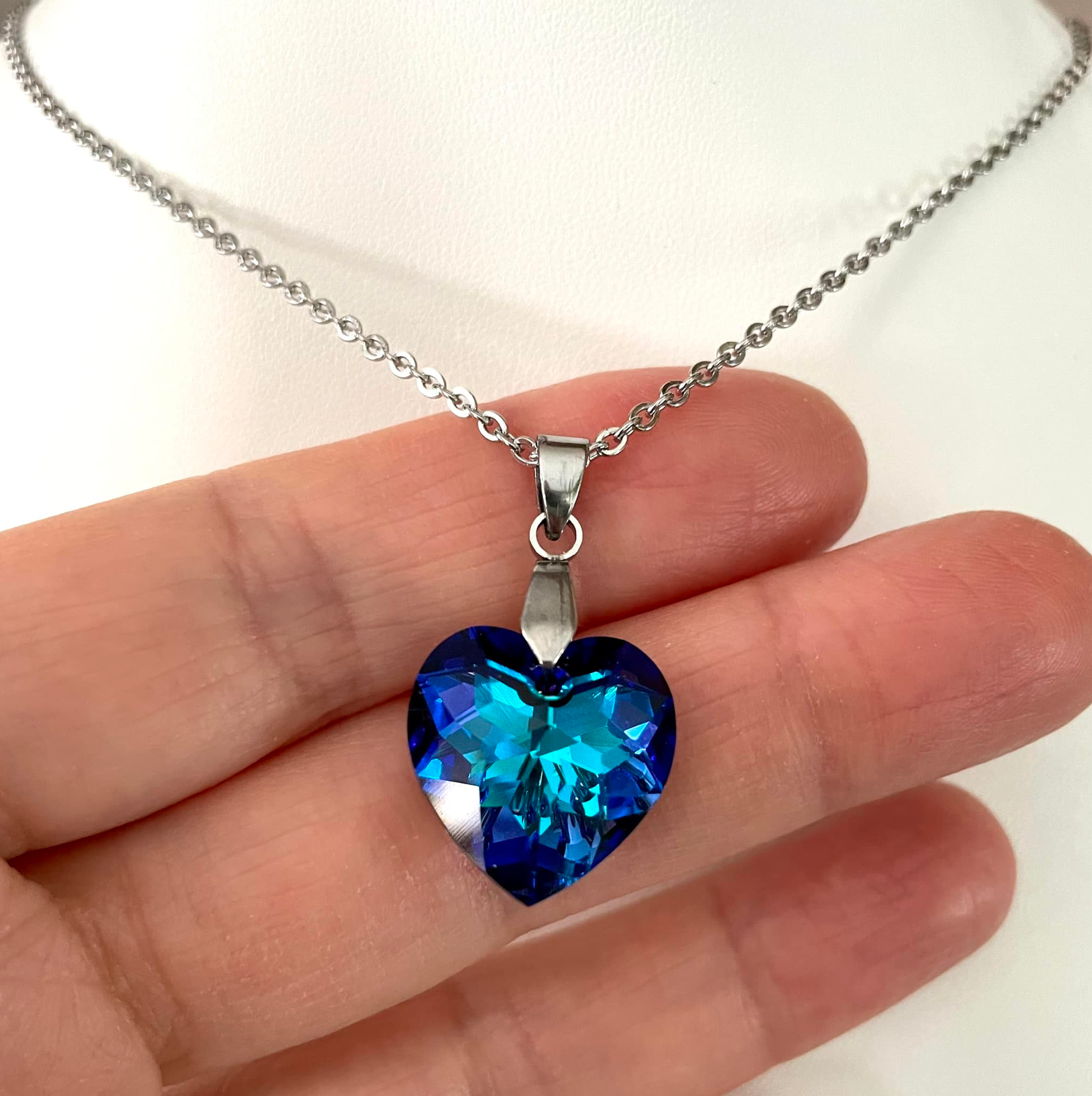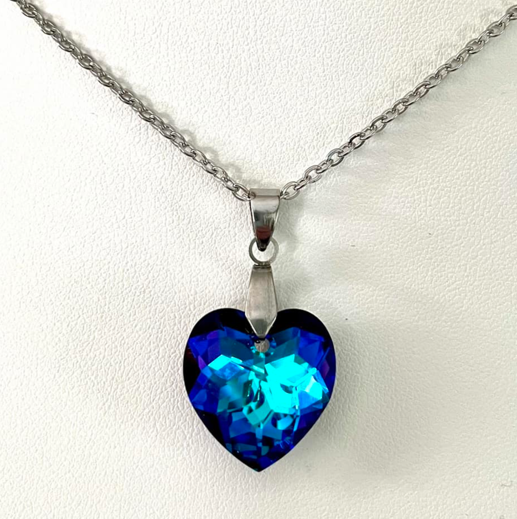 Superbe pendentif gros coeur en cristal extra-facetté Héliotrope shimmer mis en valeur avec une chaîne en acier inoxydable qui ne ternit pas. Diamètre du coeur: 18mm, c’est -à-dire environ la grosseur d’un 5 cents.