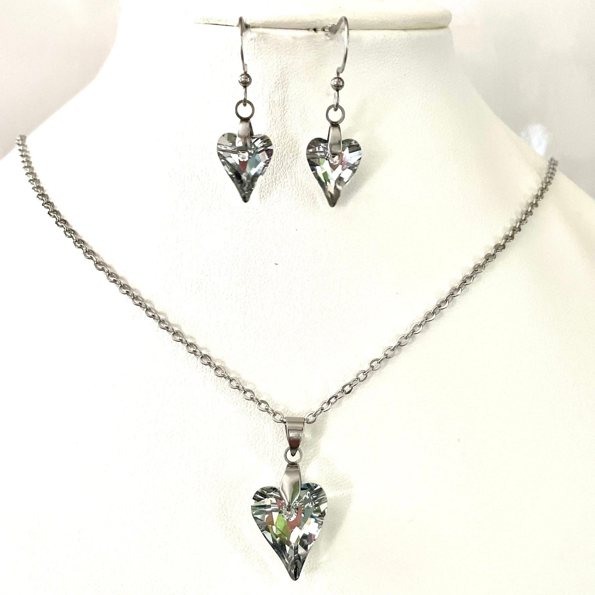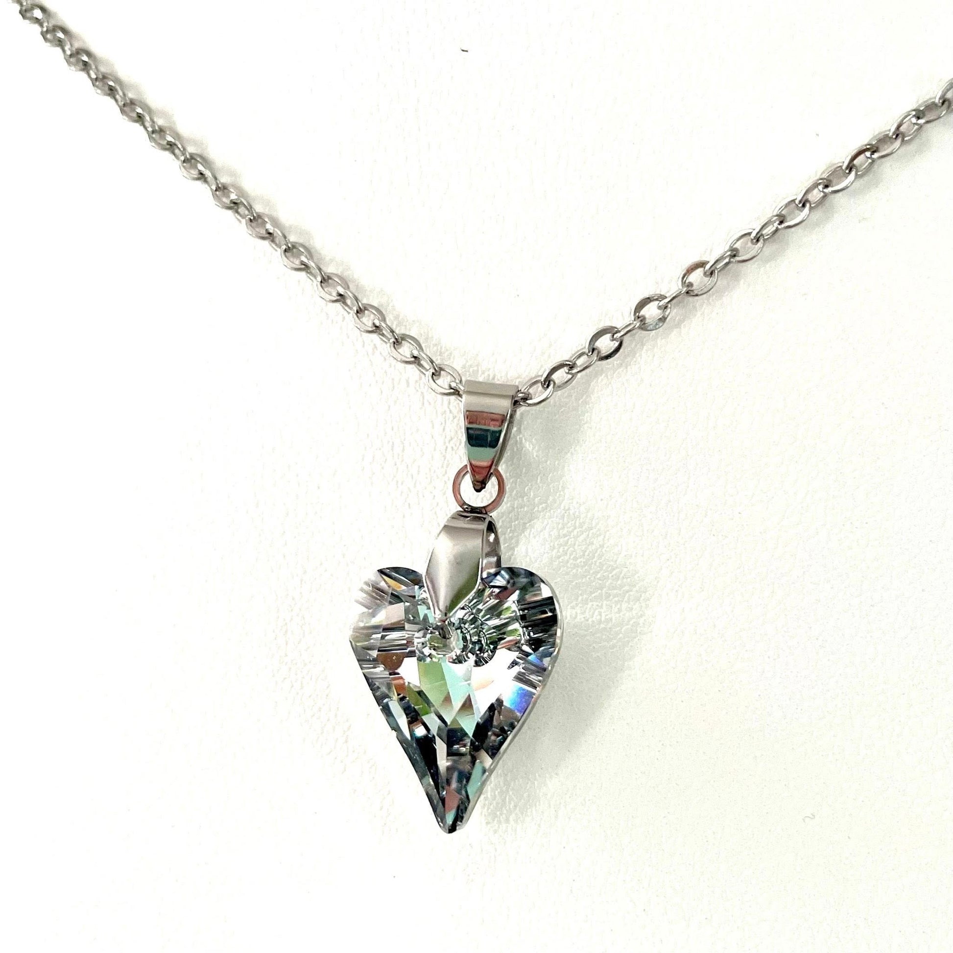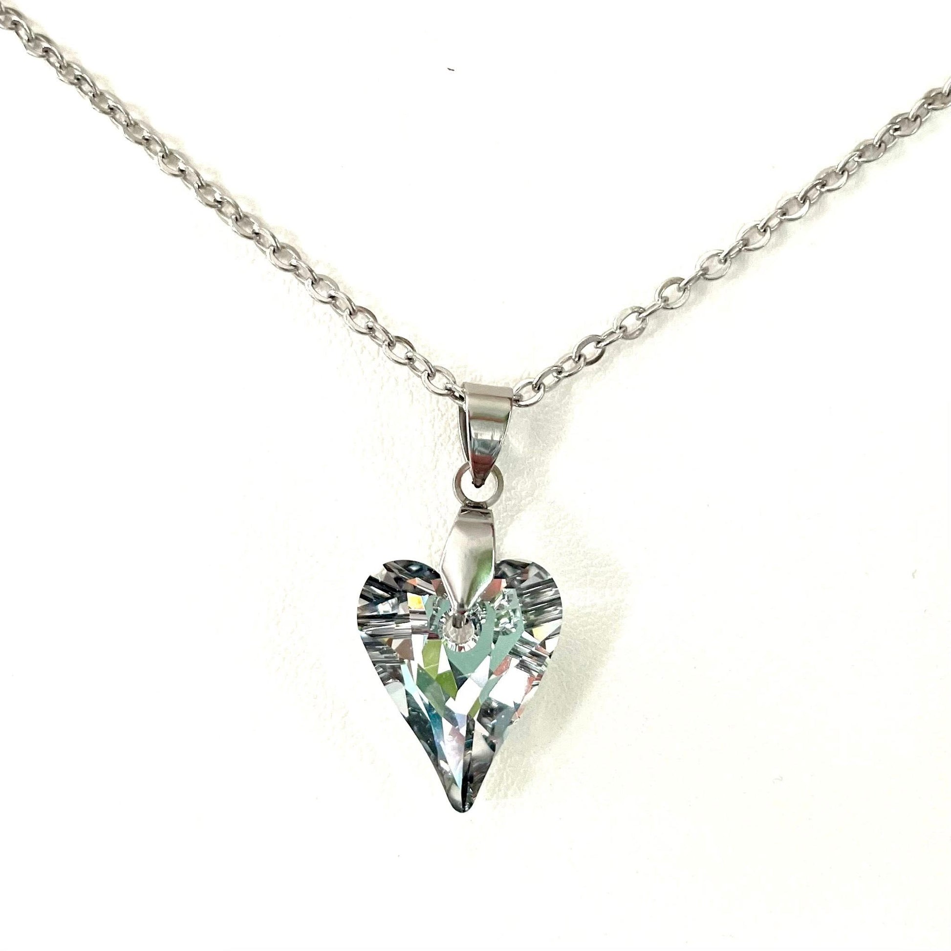 Superbe collier gros coeur sauvage en cristal argenté mis en valeur avec une chaîne en acier inoxydable qui ne ternit pas. Dimensions du coeur: 17mm x 14mm. Boucles disponibles sur une autre fiche.