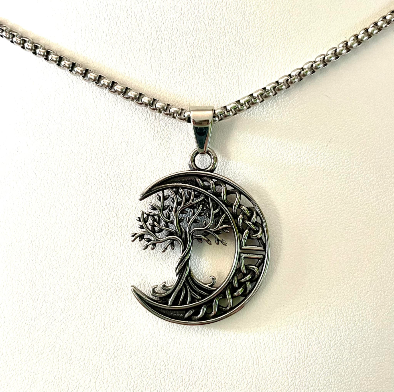 Magnifique Lune ornée d’un arbre de vie avec sa superbe chaîne! Réversible et ne ternit pas. Dimension: 44 x 28mm (avec la bélière).