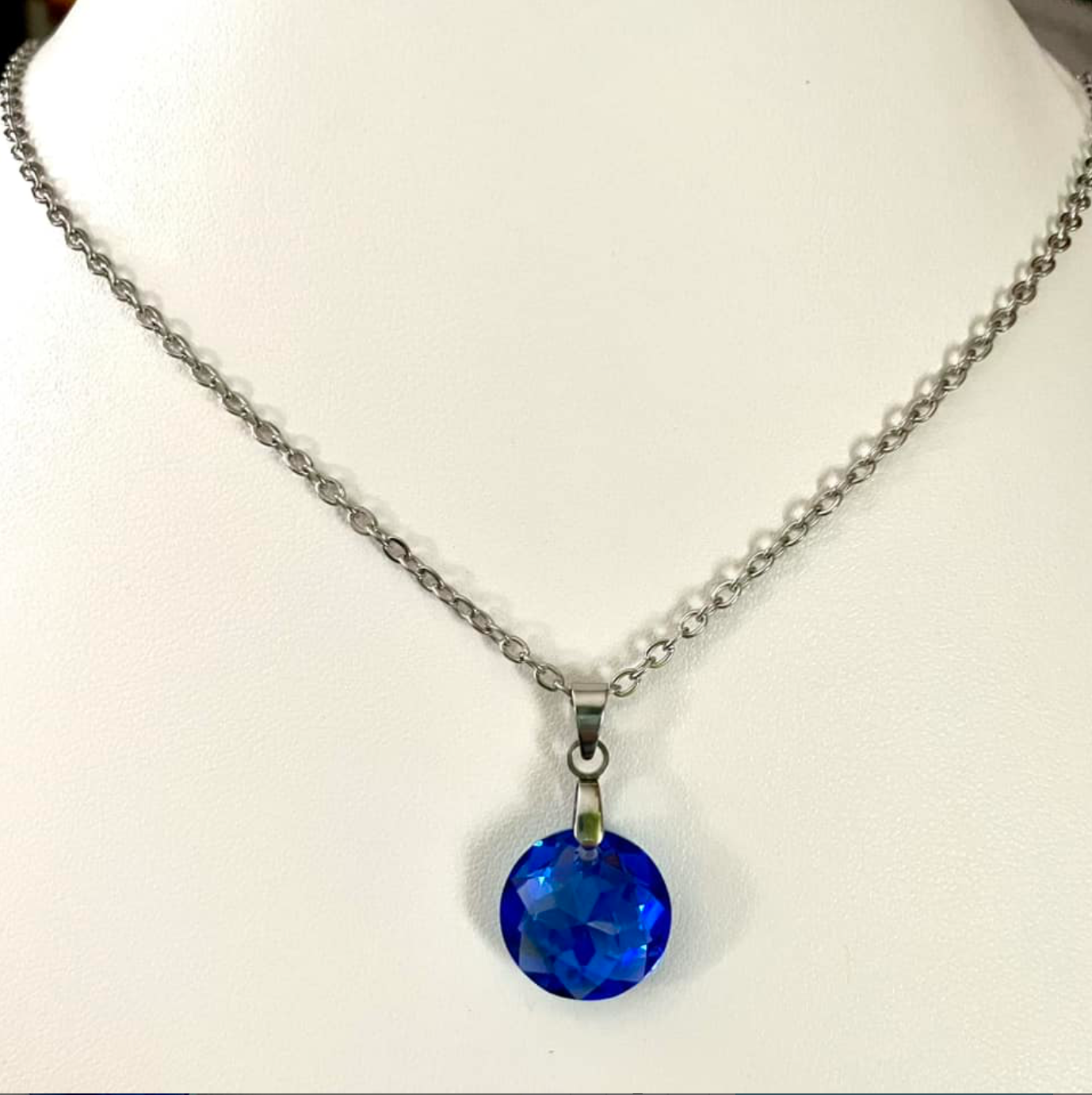 Superbe pendentif classic en cristal Saphir Shimmer mis en valeur avec une chaîne en acier inoxydable qui ne ternit pas. Diamètre: 14mm, un peu plus petit qu’un 10 cent.