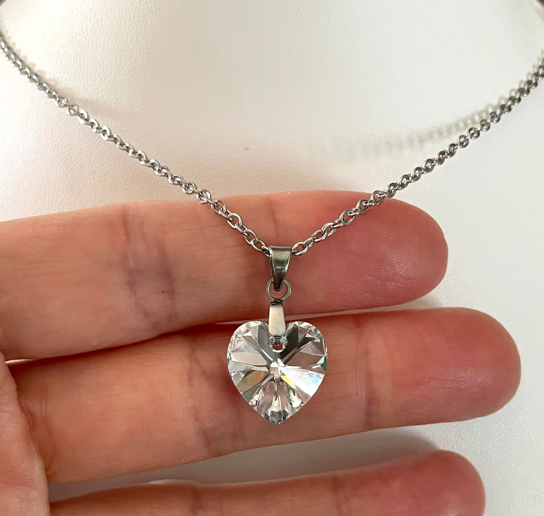 Superbe pendentif moyen coeur en cristal argenté mis en valeur avec une chaîne en acier inoxydable qui ne ternit pas. Diamètre du coeur: 14mm, c’est -à-dire environ la grosseur d’un dix cents..