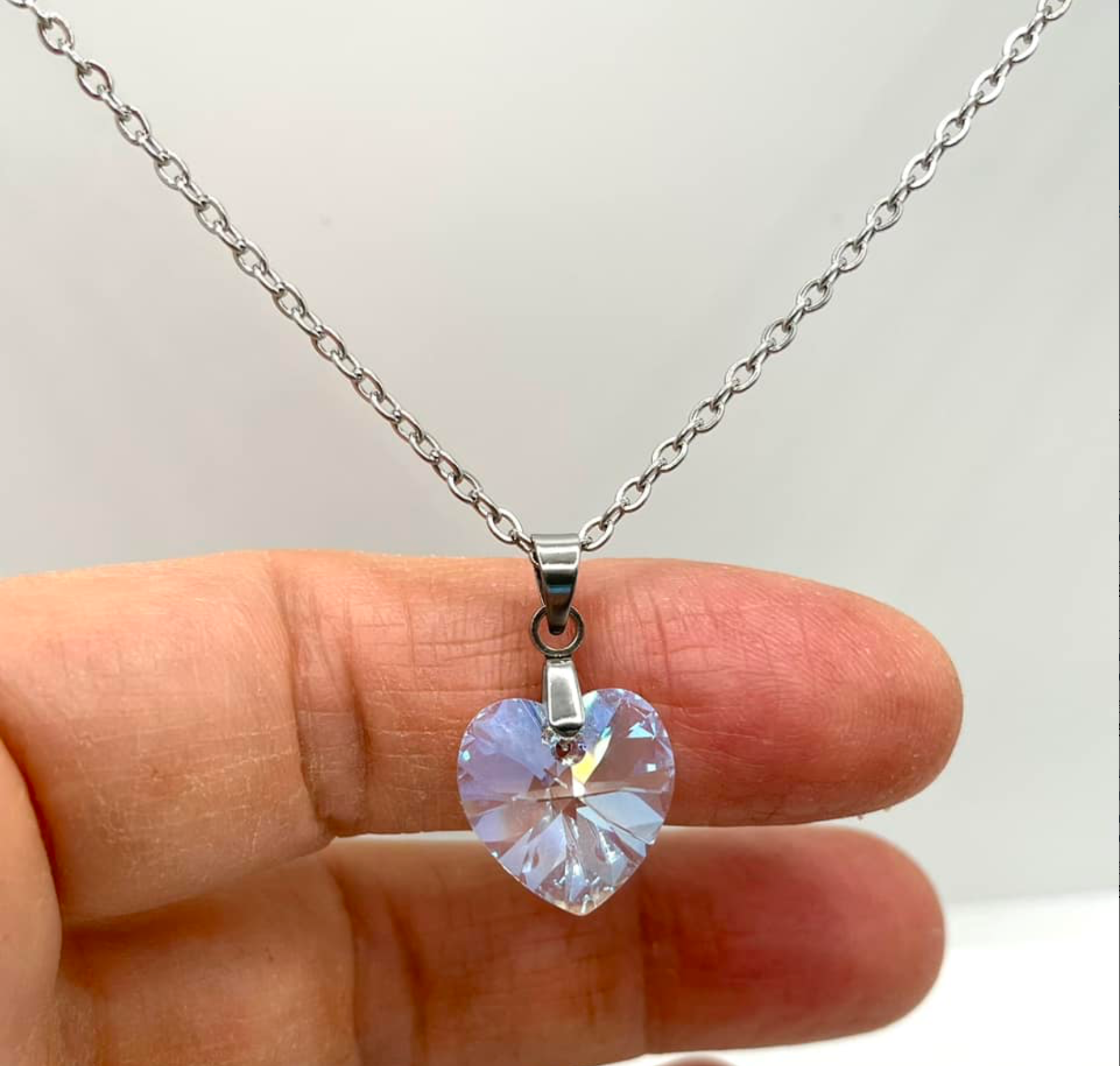 Superbe pendentif moyen coeur en cristal clair shimmer mis en valeur avec une chaîne en acier inoxydable qui ne ternit pas. Diamètre du coeur: 14mm, c’est -à-dire environ la grosseur d’un dix cents..