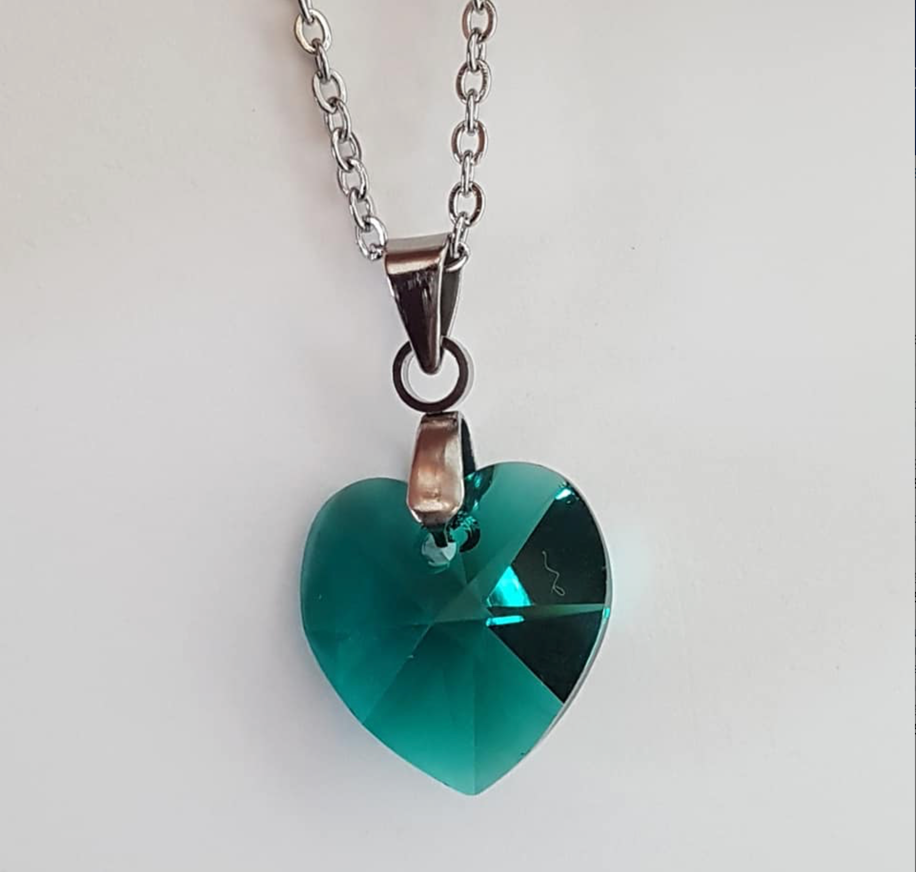 Superbe pendentif moyen coeur en cristal émeraude translucide mis en valeur avec une chaîne en acier inoxydable qui ne ternit pas. Diamètre du coeur: 14mm, c’est -à-dire environ la grosseur d’un dix cents..