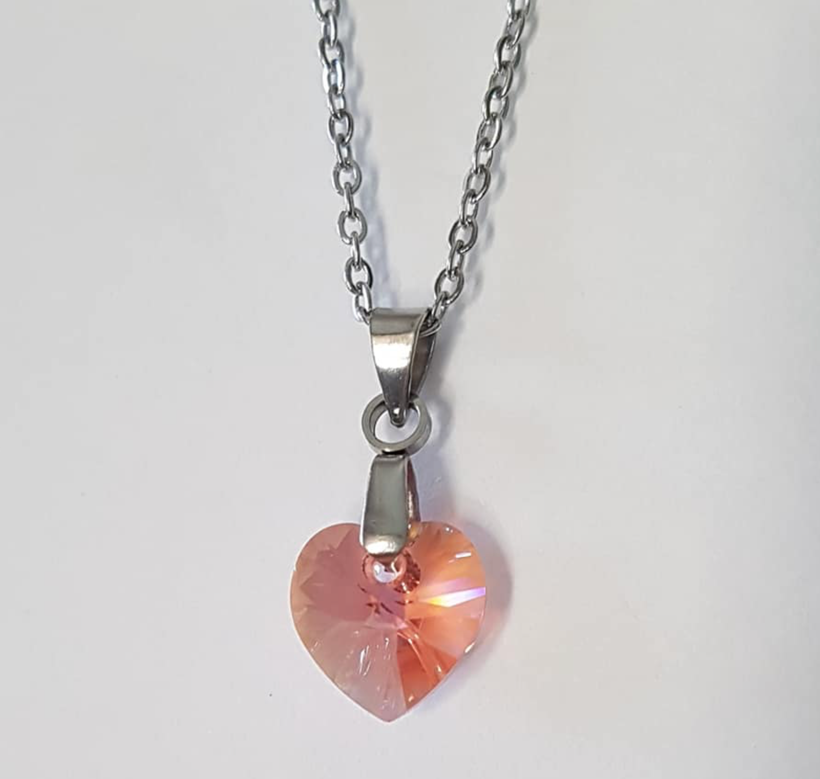 Superbe pendentif petit coeur en cristal Pêche Shimmer mis en valeur avec une chaîne en acier inoxydable qui ne ternit pas. Diamètre du coeur: 10mm