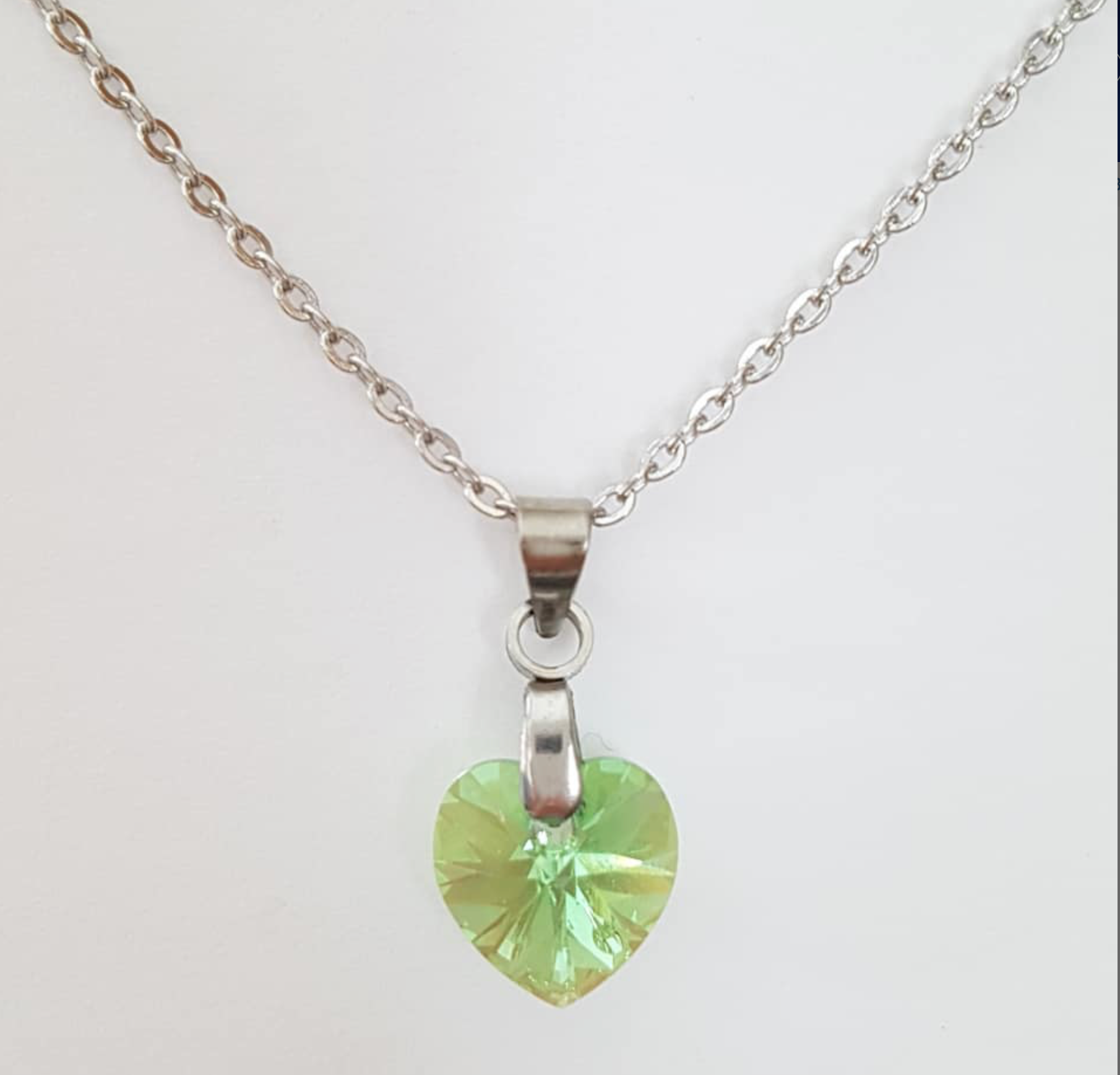 Superbe pendentif petit coeur en cristal Péridot AB mis en valeur avec une chaîne en acier inoxydable qui ne ternit pas. Diamètre du coeur: 10mm
