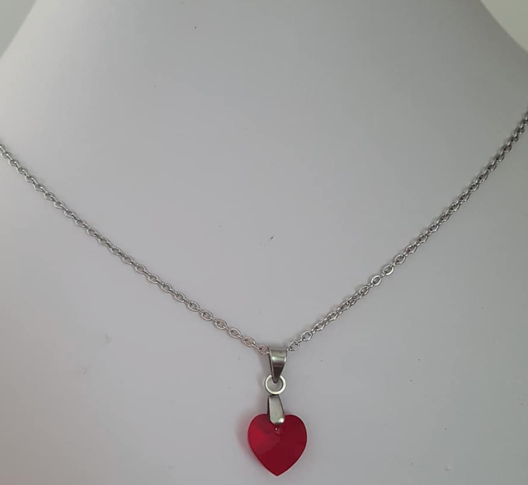 Superbe pendentif petit coeur en cristal Rouge profond (Siam). Mis en valeur avec une chaîne en acier inoxydable qui ne ternit pas. Diamètre du coeur: 10mm.