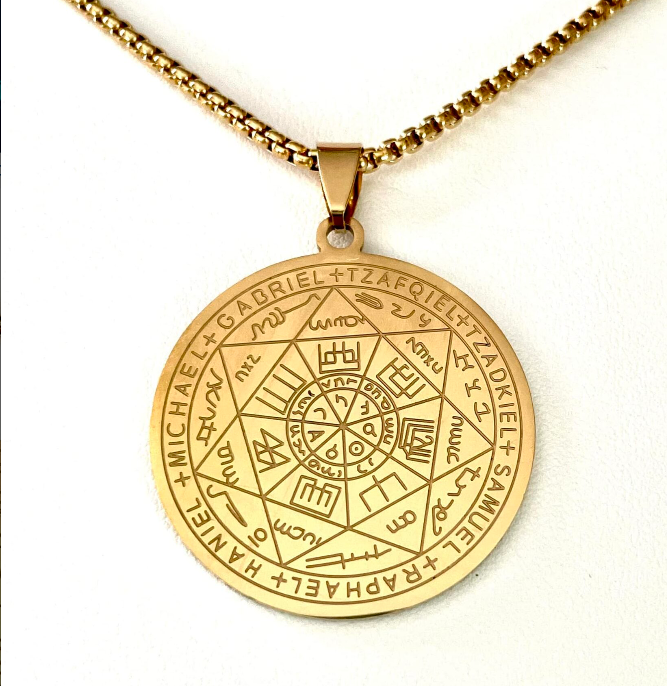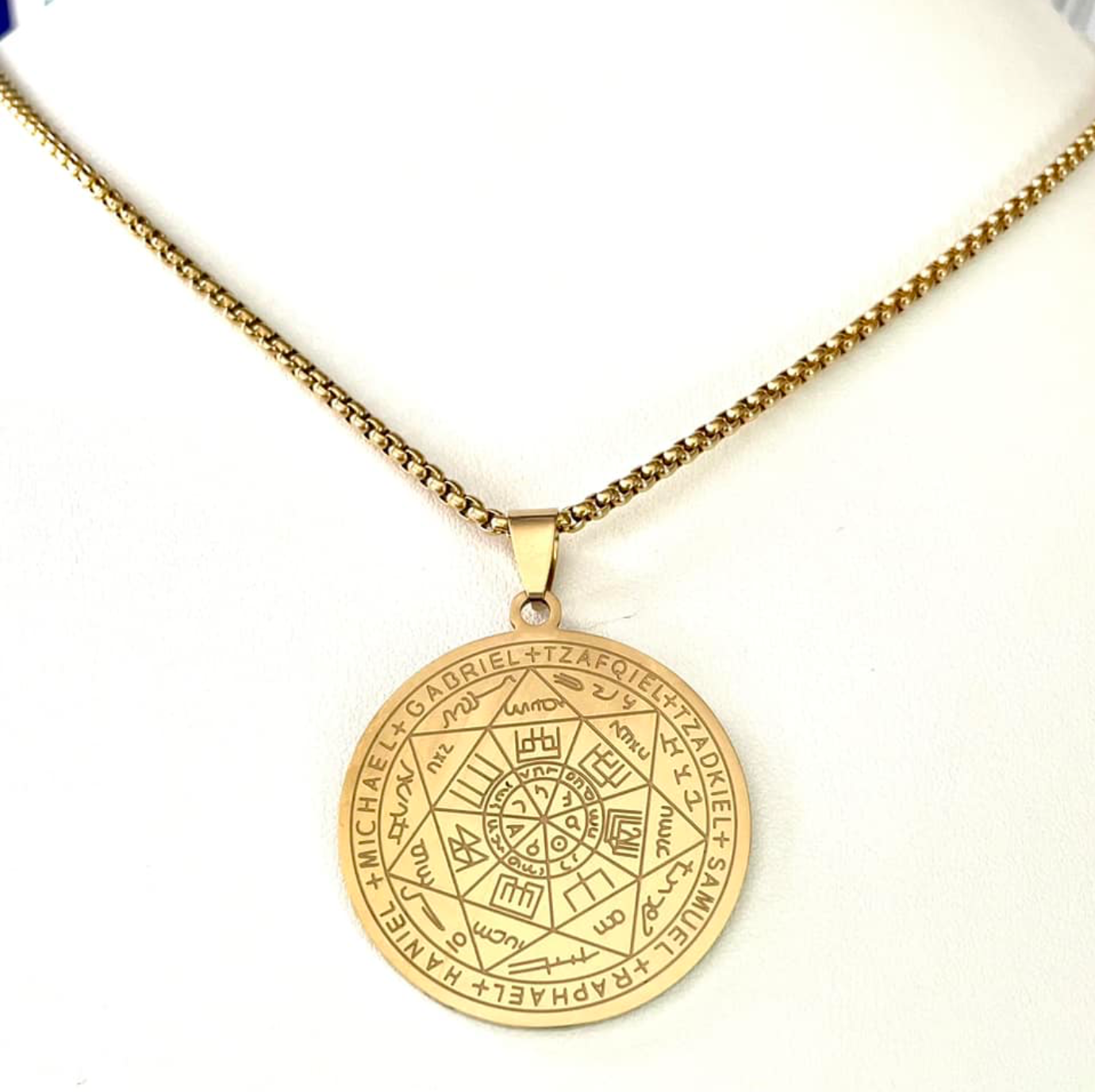 Pendentif Protection des 7 Archanges en inox doré. C’est une protection très puissante contre toutes les énergies négatives. Il confère confiance et abondance.Il contient le noms des 7 archanges : Michael, Raphael, Gabriel, Tsafkiel, Zadkiel, Samuel et Haniel. Collier unisexe. Dimension: 38 x 38mm