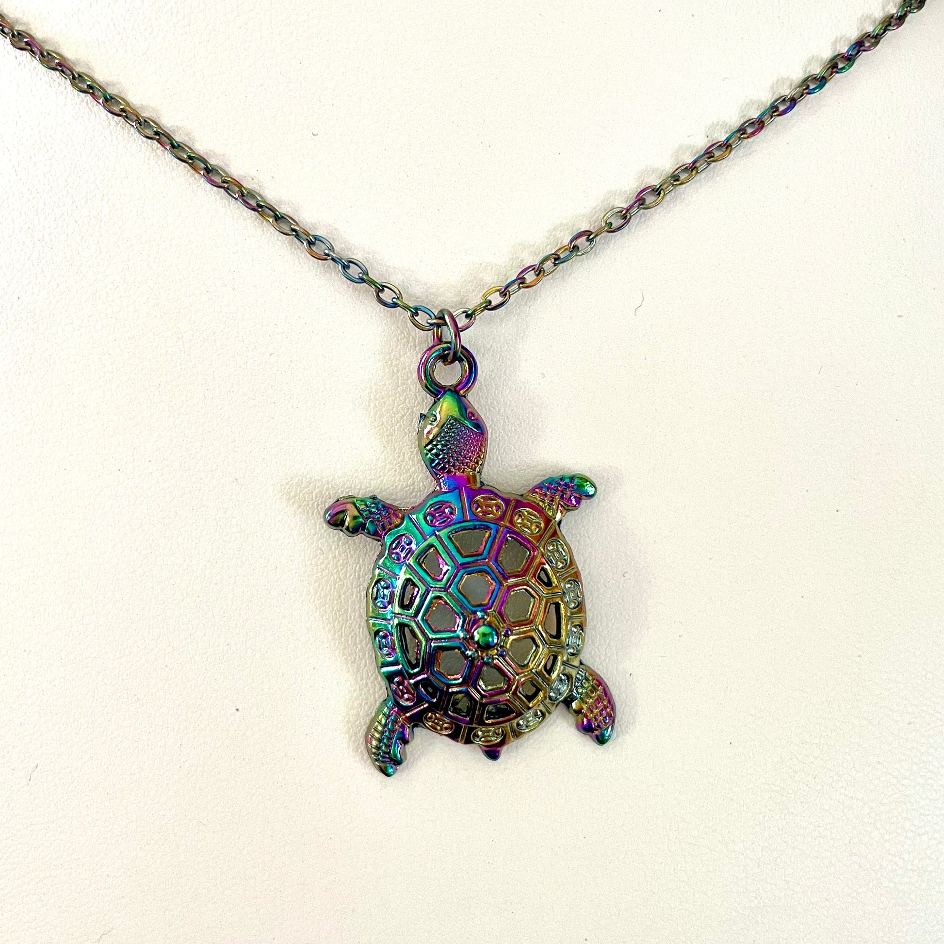 Pendentif Tortue en inox multicolore qui ne ternit pas. Dimensions: 40x 23mm. Légères variations de couleurs pour chaque pendentifs. chacun est unique.