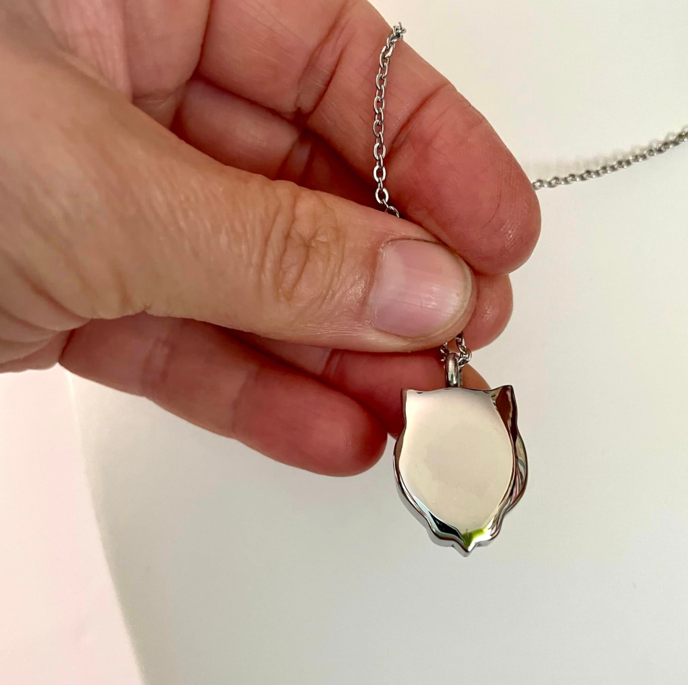 Urne Pendentif Hibou et chaîne en acier inoxydable. Vous pouvez y mettre une prière, des cendres ou un goutte de parfum. Dimension: 28x18m